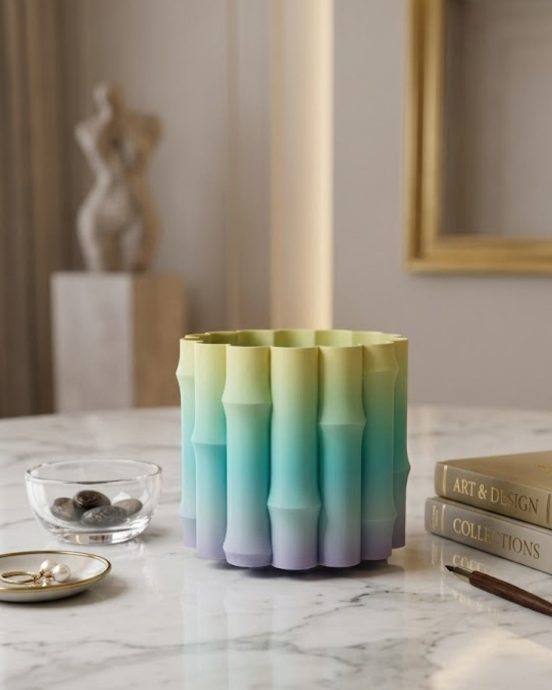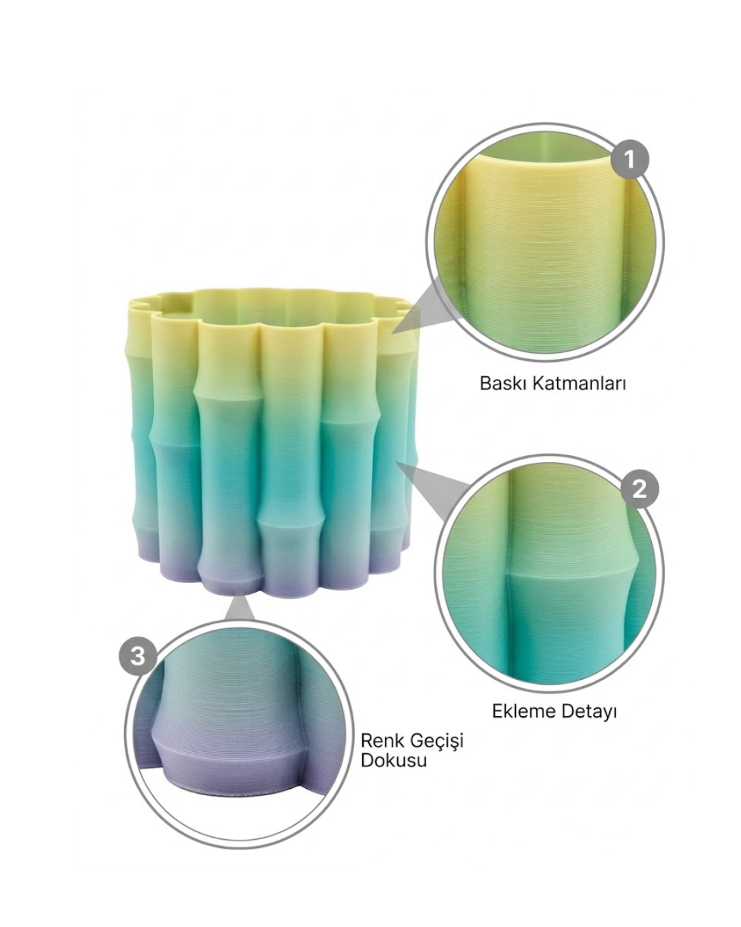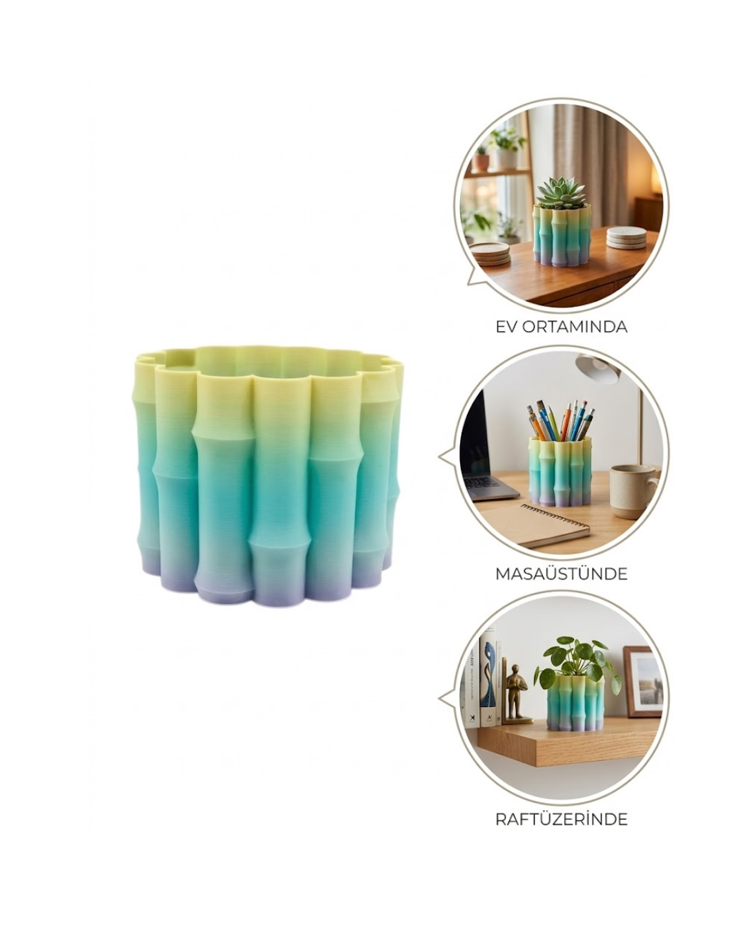 Estetik ve fonksiyonelliği bir araya getiren bu yeşil dekoratif vazo, modern yaşam alanlarında fark yaratmak isteyenler için tasarlanmıştır. Yumuşak renk geçişleri ve dikkat çekici yüzey formu sayesinde bulunduğu ortamda güçlü bir görsel etki oluşturur. Minimal tasarım anlayışı ile sade ama şık bir dekoratif obje olarak öne çıkar. Ürünün yüzeyinde yer alan özel form detayları, ışığın farklı açılarda yansımasını sağlayarak ürüne hareket kazandırır. Açık yeşilden daha koyu tonlara doğru geçiş yapan renk yapısı, ortama doğal ve huzurlu bir atmosfer katar. Bu özellik, ürünü hem dekoratif hem de estetik açıdan değerli bir parça haline getirir. Salon, ofis, yatak odası veya çalışma alanlarında rahatlıkla kullanılabilir. Raf, sehpa veya masa üstü gibi farklı alanlarda konumlandırılabilir. İçine yerleştirilecek çiçekler ile daha canlı bir görünüm elde edilebilir veya sade haliyle minimalist bir dekor oluşturulabilir. Hafif ve sağlam yapısı sayesinde uzun süreli kullanım sunar. Taşınabilir olması sayesinde farklı alanlarda rahatlıkla kullanılabilir. Modern tasarımı ile hem günlük kullanım hem de hediye alternatifi olarak tercih edilebilir. Bulunduğu ortama ferahlık ve zarafet katan bu dekoratif vazo, sade ama etkili bir dekorasyon arayanlar için mükemmel bir seçimdir.