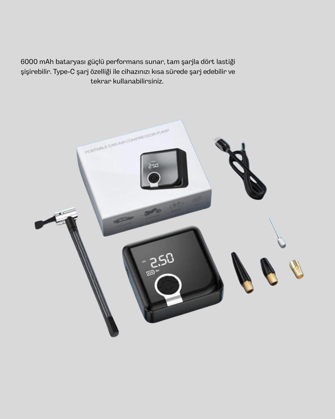 150 PSI yüksek basınç gücüne sahip Taşınabilir Akıllı Hava Kompresörü, modern sürücülerin ve aktif yaşam tarzını benimseyen kullanıcıların ihtiyaçlarına göre tasarlanmıştır. Kompakt boyutları ve hafif tasarımı sayesinde aracınızda çok az yer kaplar, gerektiği her anda kolayca ulaşabilir ve hızlı bir şekilde kullanabilirsiniz. Hem otomobil hem de motosiklet ve bisiklet lastikleri için ideal olan bu cihaz, çok yönlü şişirme kapasitesiyle öne çıkar. Dijital ekranı, basınç değerlerini net ve okunaklı bir şekilde gösterir. PSI, BAR ve diğer birimleri tek tuşla değiştirebilir, doğru basınç seviyesini kolayca ayarlayabilirsiniz. Akıllı otomatik durdurma sistemi sayesinde cihaz, belirlenen basınca geldiğinde kendiliğinden kapanır. Bu özellik, lastiklerin fazla şişmesini engellerken kullanıcıya güvenli ve kolay bir deneyim sunar. 6000 mAh güçlü bataryası uzun süreli kullanım sağlar. Tek şarjla dört lastiğin şişirilebilmesi, cihazın performans gücünü net bir şekilde ortaya koyar. Type-C girişi sayesinde hızlı şarj edilebilir ve taşınabilir şarj cihazlarıyla dahi desteklenebilir. Bu yönüyle kamp ve seyahatlerde büyük avantaj sağlar. LED aydınlatma sistemi, karanlık ortamlarda kullanım kolaylığı sunarken, SOS modu acil durumlarda görünürlüğünüzü artırarak güvenliğinizi sağlar. Cihazın gövdesi dayanıklı ve ergonomik olarak tasarlanmıştır. Elinizde rahatça tutabilir, uzun süreli kullanımlarda bile konfor hissedersiniz. Şişirme uçlarının farklı aparatlarla sunuluyor olması sayesinde spor toplarından kamp ekipmanlarına kadar geniş bir kullanım alanı sağlar. Pratik, hızlı ve güvenli kullanım sunan bu taşınabilir hava kompresörü, her araçta bulunması gereken temel ekipmanlardan biridir. Günlük hayatı kolaylaştıran kompakt tasarımıyla her ortamda yanınızda taşıyabilirsiniz.