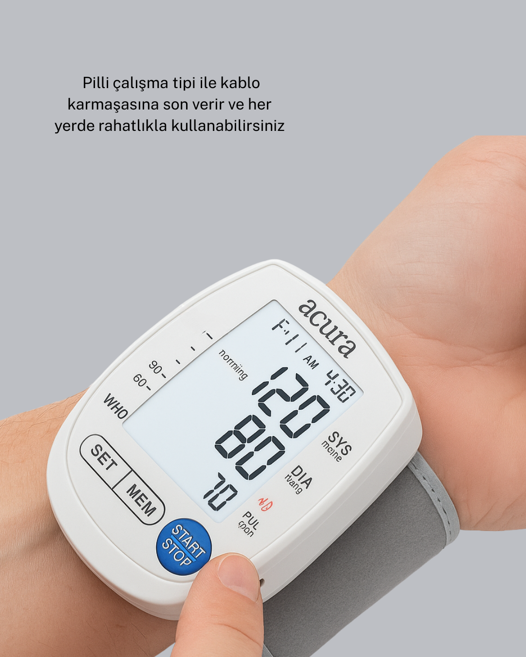 Hem pilli hem şarjlı çalışma özelliğine sahip bu bilekten tansiyon ölçer, günlük tansiyon takibini en pratik ve güvenilir şekilde yapabilmeniz için tasarlanmıştır. Bileğe kolayca takılır ve tek tuşla hızlı ölçüm yapar. Dijital ekranı büyük ve nettir; yaşlı kullanıcılar dahil herkes ölçüm sonuçlarını rahatlıkla görebilir. Ölçüm saniyeler içinde tamamlanır ve cihaz tansiyon değerlerini anlaşılır bir şekilde ekranda gösterir. Pilli kullanım seçeneği, cihazı dilediğiniz her yerde kullanabilmenizi sağlarken, şarjlı mod sayesinde pil değişimi derdinden de kurtulursunuz. Bu çift güç sistemi cihazı hem ekonomik hem de son derece kullanışlı hâle getirir. Hafıza özelliği, önceki ölçümlerinizi saklar ve tansiyon değişimlerinizi düzenli olarak takip etmenize yardımcı olur. Böylelikle sağlık takibinizi daha kontrollü şekilde yapabilirsiniz. Küçük, hafif ve taşınabilir yapısıyla evde, işte, seyahatte ya da dışarıda tansiyonunuzu anında kontrol edebilirsiniz. Güvenilir, modern ve kullanımı kolay bir tansiyon aleti arayanlar için ideal bir seçimdir.