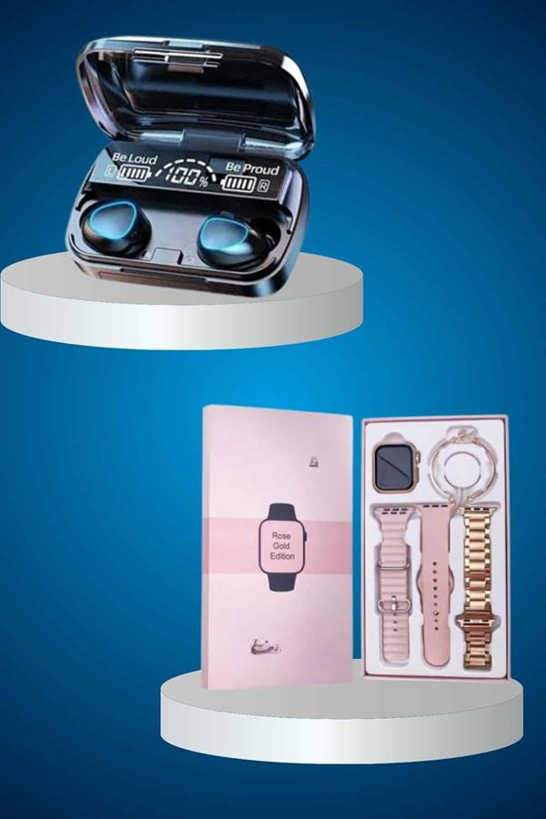 AKILLI SAATYeni Nesil Mini Kadın Akıllı Saat, şıklığı ve fonksiyonelliği bir araya getiren tasarımıyla kadınlar için ideal bir seçenek sunuyor. Almanya üretimi ultra dayanıklı model, özel wireless şarj özellikleriyle öne çıkıyor ve Türkçe menüsü sayesinde kullanıcı dostudur. Kutu içeriğinde, mini akıllı saat, 3 farklı kordon, hediye bileklik, wireless şarj kablosu ve kullanım kılavuzu bulunmaktadır. Şık pembe kutusu, hediye olarak tercih edilmesini sağlayan bir özellik taşır. 41 mm kavisli oval kenarlı yeni tasarımı ve 1,70 inç AMOLED ekranı ile yüksek çözünürlükte HD görüntü sağlar.Saat, nabız ölçer, uyku izleyici, kan basıncı, tansiyon, EKG ve vücut sıcaklığı ölçer gibi sağlık izleme özellikleriyle sağlığınızı takip etmenizi sağlar. 117 farklı spor modu ve adım, kalori, kalp ritmi ölçme gibi özellikler ile aktivite takibini oldukça detaylı yapabilirsiniz. Ayrıca akıllı hatırlatıcılar sayesinde su içme ve hareketsizlik gibi hatırlatmalar alabilir, tüm bildirimleri ve mesajları anında saatinizde görebilirsiniz.Bluetooth bağlantısı ile yüksek kaliteli müzik dinleyebilir ve uzaktan fotoğraf çekme özelliği ile fotoğraflarınızı kolayca çekebilirsiniz. Suya dayanıklı yapısı, günlük kullanımda sıklıkla tercih edilmesini sağlar; ancak deniz ve havuz gibi basınçlı suya karşı su geçirmez.Saatin sunduğu diğer özellikler arasında Türkçe ve çoklu dil desteği, saatimi bul, telefonumu bul, alarm, kronometre, hava durumu, hesap makinesi gibi fonksiyonlar bulunur. Kordonu değiştirilebilir, bu sayede kişisel tercihlere göre tasarımı özelleştirilebilir. 24 ay garanti süresi ile kullanıcılarına güvenli bir deneyim sunar.KULAKLIKYeni M10 Bluetooth Kulaklık, güçlü ses performansı ve çift mikrofon teknolojisi ile müzik dinlerken ve telefon görüşmeleri yaparken üstün bir deneyim sunar. Ses aktarımı sırasında gecikme yaşanmaz, bu da net ve kesintisiz iletişim sağlar. Süper 3D ses kalitesi, müzik dinlerken ses gecikmesini ortadan kaldırarak etkileyici bir performans sergiler. Spor ve egzersiz sırasında rahatça yerinde kalan tasarımı ile konforlu kullanım sunar.Yüksek kaliteli malzemelerle üretilen M10 kulaklık, dayanıklılığı ve ses kalitesiyle öne çıkar. Terlemeye dayanıklı ve su geçirmez özellikleri sayesinde uzun süreli kullanıma uygundur. Geliştirilmiş lithium polymer bataryası, kulaklıkla birlikte 16 saat kesintisiz müzik dinleme süresi sağlar.Tuşlu (manuel) kontrol sistemi, gelen aramaları kolayca cevaplamanızı ve sonlandırmanızı sağlar. Ayrıca, telefonunuzu elinize almadan ses seviyesini ayarlayabilir, müzik çalma listenizi ileri ve geri sarabilirsiniz. Tüm Android ve iOS cihazlarla uyumlu olan M10 Bluetooth kulaklık, evrensel bir modeldir.Kullanım oldukça basittir: Kulaklıkları powerbank adaptöründen çıkarın, telefonunuzun Bluetooth özelliğini açarak otomatik olarak bağlanın ve müziğinizin tadını çıkarın.