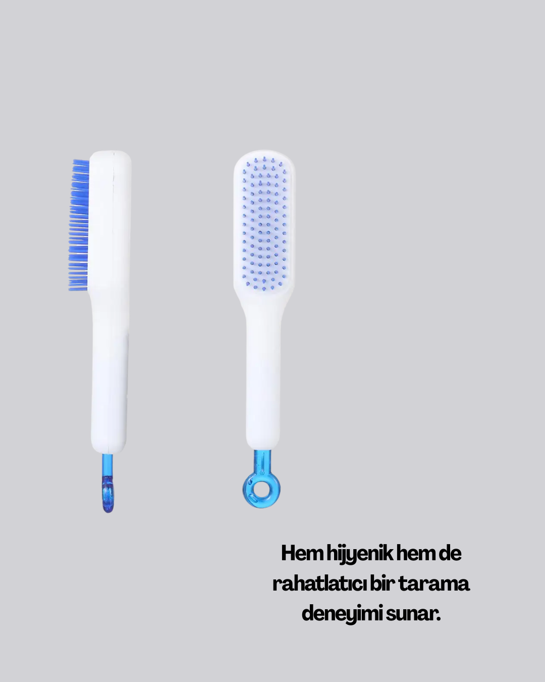 Günlük saç bakımınızı daha pratik hale getiren bu saç tarağı, kendi kendini temizleme fonksiyonuna sahiptir. Fırçaya dolanan saçları temizlemek için sapında yer alan kulpa basmanız yeterlidir.Elektriklenmeyi önleyen anti-statik tasarımı sayesinde saçlarınız daha düzenli ve sağlıklı görünür. Silikon uçlu dişleri saç derisine nazikçe temas ederek doğal bir masaj etkisi yaratır.ABS plastikten üretilen sağlam gövde, uzun süreli kullanımlarda bile dayanıklılığını korur. 22 cm uzunluğundaki fırça, ergonomik sapı ile kolay kavranır. Paket içeriği 1 adet saç tarağıdır.
