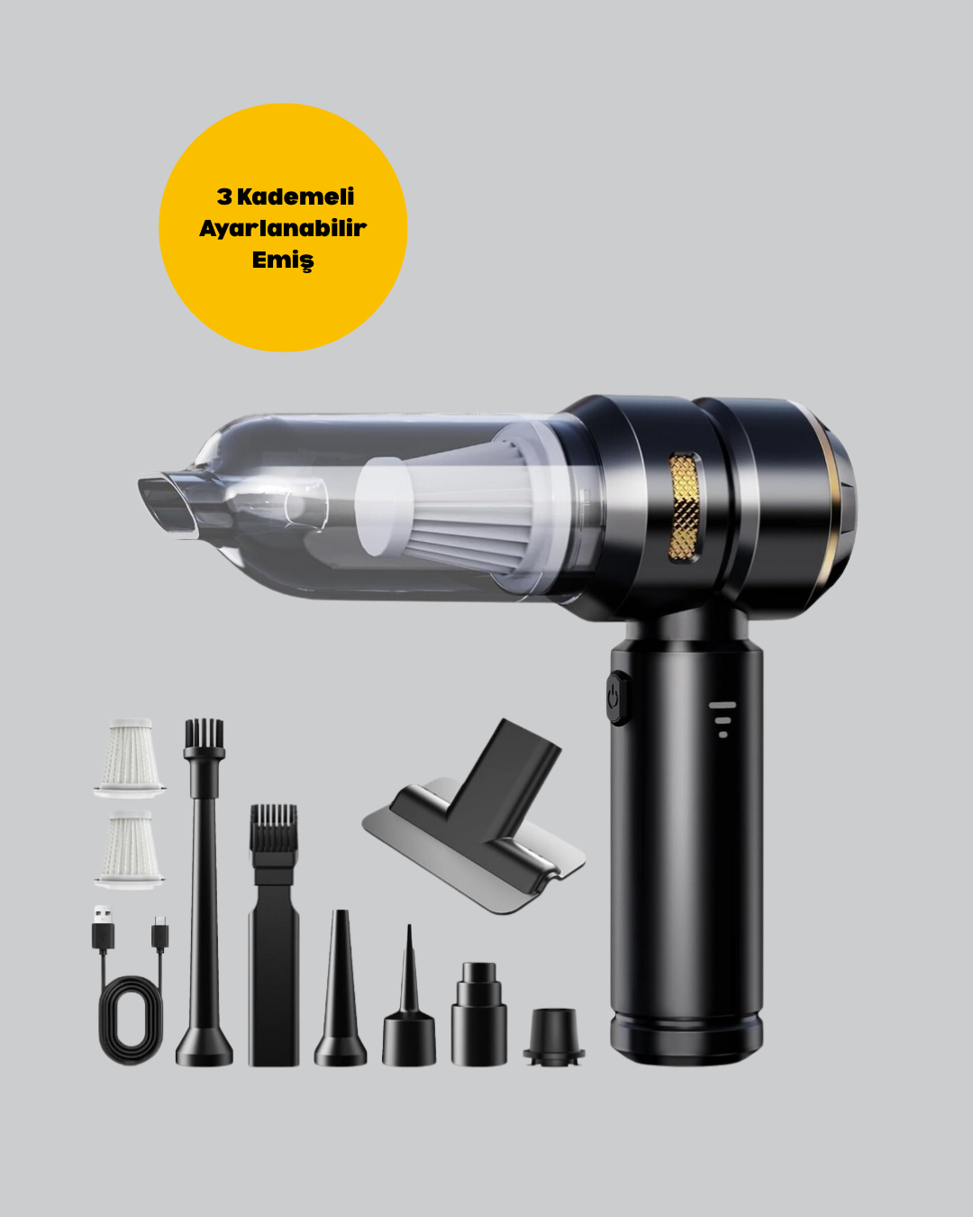 Temizlik işlerinizi pratik, hızlı ve etkili hale getiren bu kablosuz araç içi süpürge, fonksiyonel özellikleriyle hayatınızı kolaylaştırıyor. 2 in 1 fonksiyonlu yapısı sayesinde hem vakumlama hem de üfleme özelliğini bir arada sunuyor. 15.000 PA güçlü emiş kapasitesiyle en küçük tozlardan inatçı kir ve kırıntılara kadar her şeyi kolayca temizler. Üç kademeli emiş seçeneğiyle kullanım alanına göre ayarlama yapabilirsiniz. HEPA filtre sistemi tozları yüksek verimlilikle hapsederek temiz ve sağlıklı bir ortam oluşturur. Yıkanabilir filtre özelliği sayesinde hijyenik kullanım ve uzun ömürlü performans elde edersiniz. Geniş toz haznesi kolayca boşaltılabilir ve temizlenebilir. Kompakt ve hafif yapısı, ergonomik tutma kolu ile birleşerek uzun süreli kullanımda bile konfor sağlar. Sessiz çalışan motoru, her ortamda rahatlıkla kullanım imkânı tanır. Farklı başlık seçenekleri ile dar alanlardan hassas yüzeylere kadar her köşeyi derinlemesine temizlemeniz mümkün olur. Araç içi detaylı temizlik için ideal olan bu süpürge, aynı zamanda evinizde küçük alanlarda da çok yönlü kullanım sağlar. Fonksiyonel özellikleri ve güçlü performansıyla her an yanınızda olacak pratik bir temizlik yardımcısıdır.