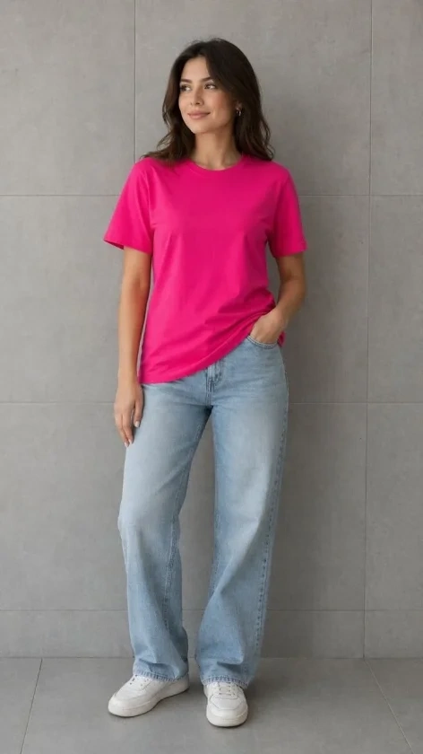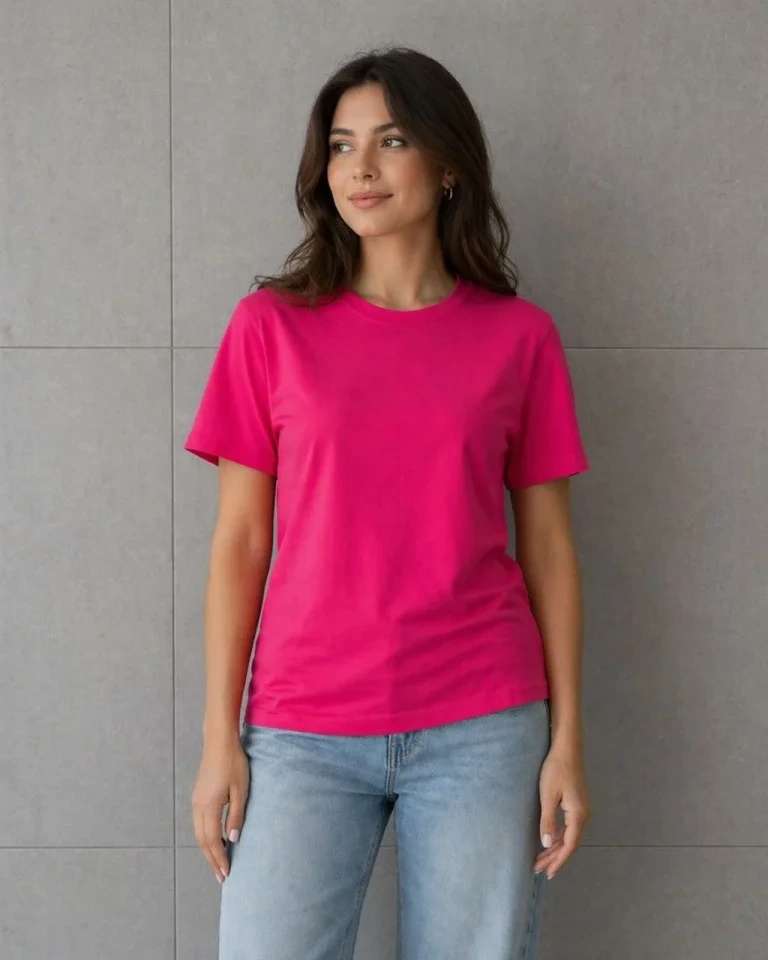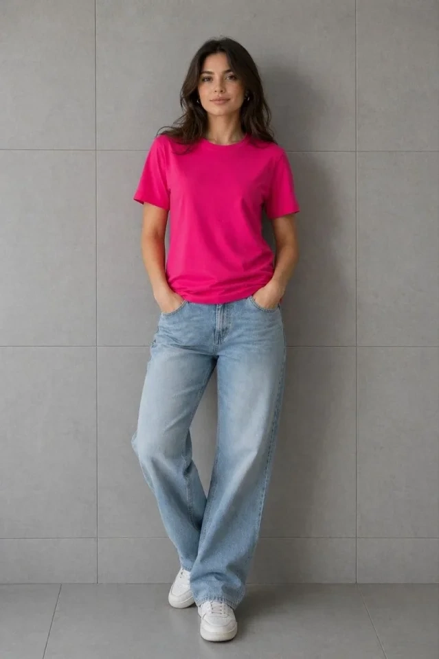 Basic Pamuklu Tişört Bisiklet Yaka Düz Renk Relaxed Fit T-Shirt - Fuşya