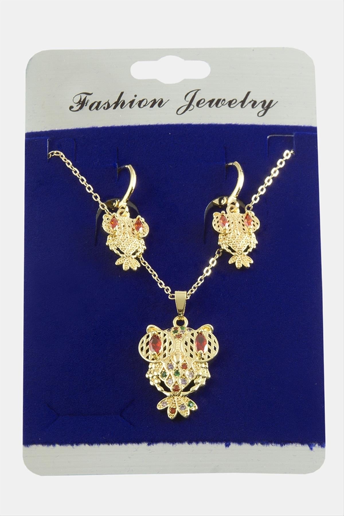 Kolye; Ürün malzemesi metal ve zirkon taştan üretilmiştir. 1 sınıf kaliteli malzeme kullanılmıştır. Ürün 1 adet kolye, ve 1 adet çift küpe vardır. Ürün zincir uzunluğu 45 santimdir. Ürün ucundaki taşlı aparat boyu 2 cmdir.