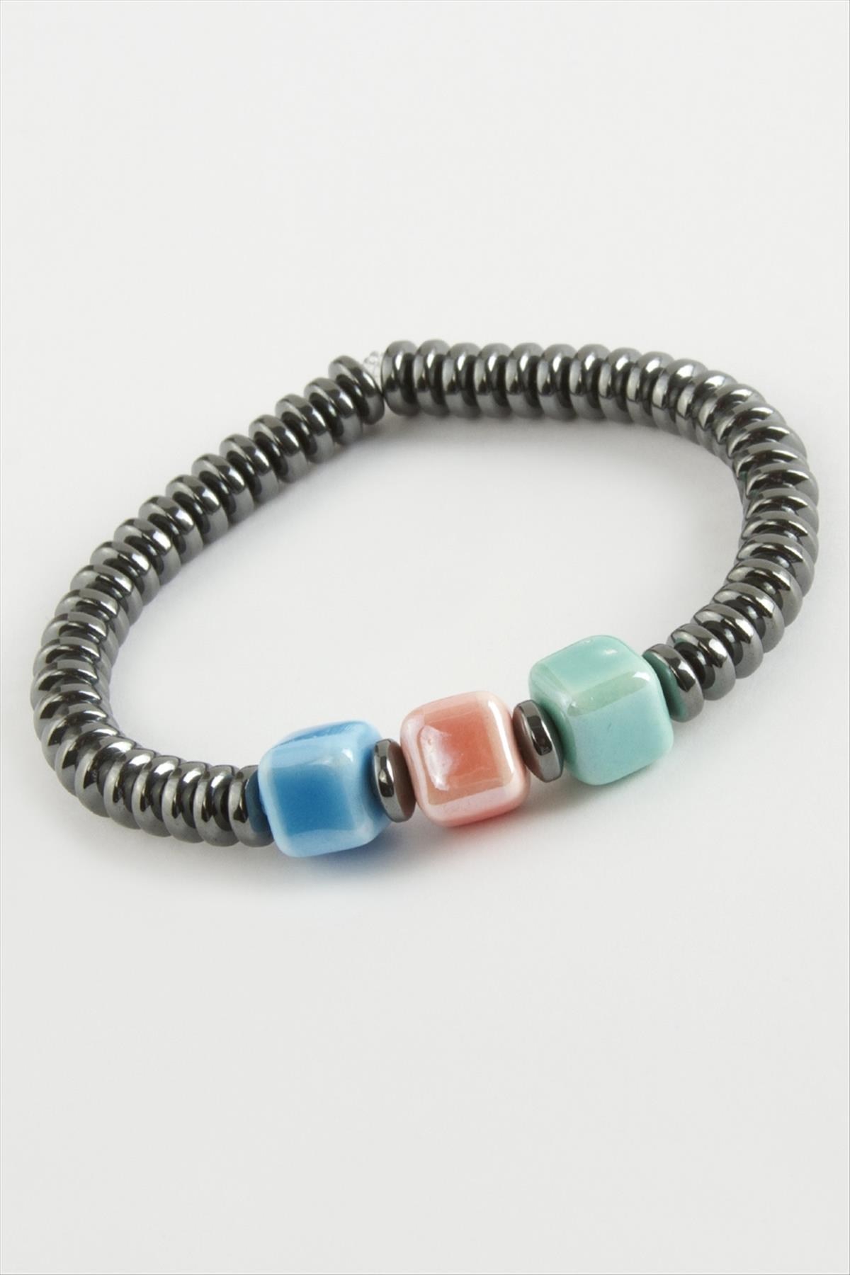 Bileklik: Ürün malzemesi cam murano ve hematit doğaltaşından imal edilmiştir. Misina üzerine dizilmiş ve esneme özelliği bulunmaktadır.