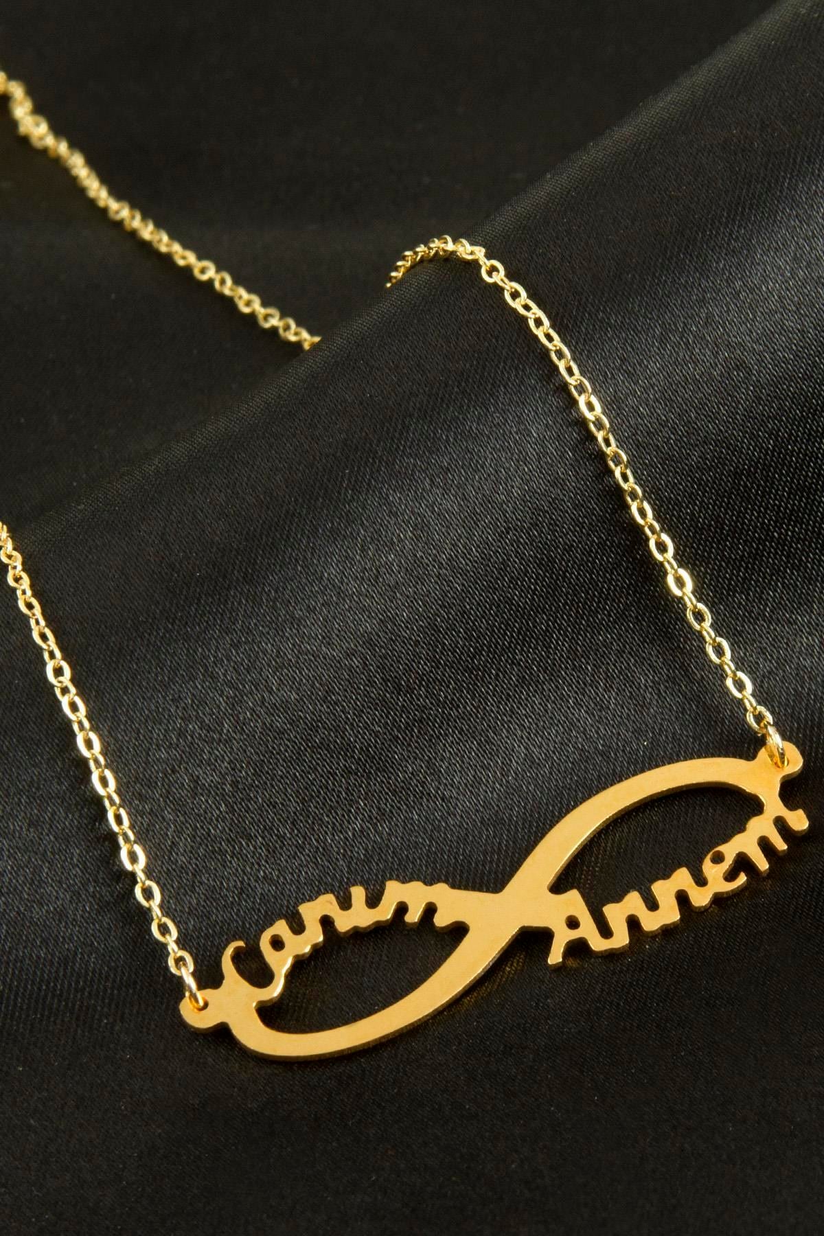 Kolye; Ürün malzemesi metaldir. Ucunda Sonsuzluk figürü vardır. altın kaoplamadır kararma yapmaz.