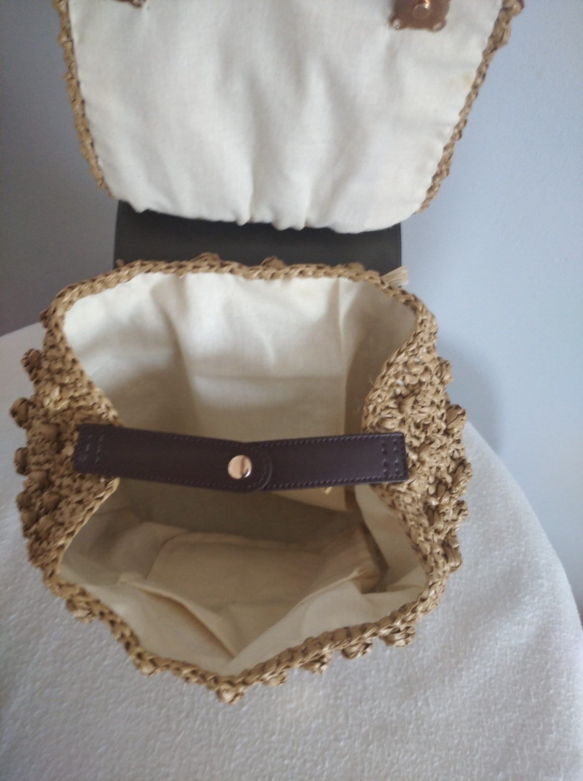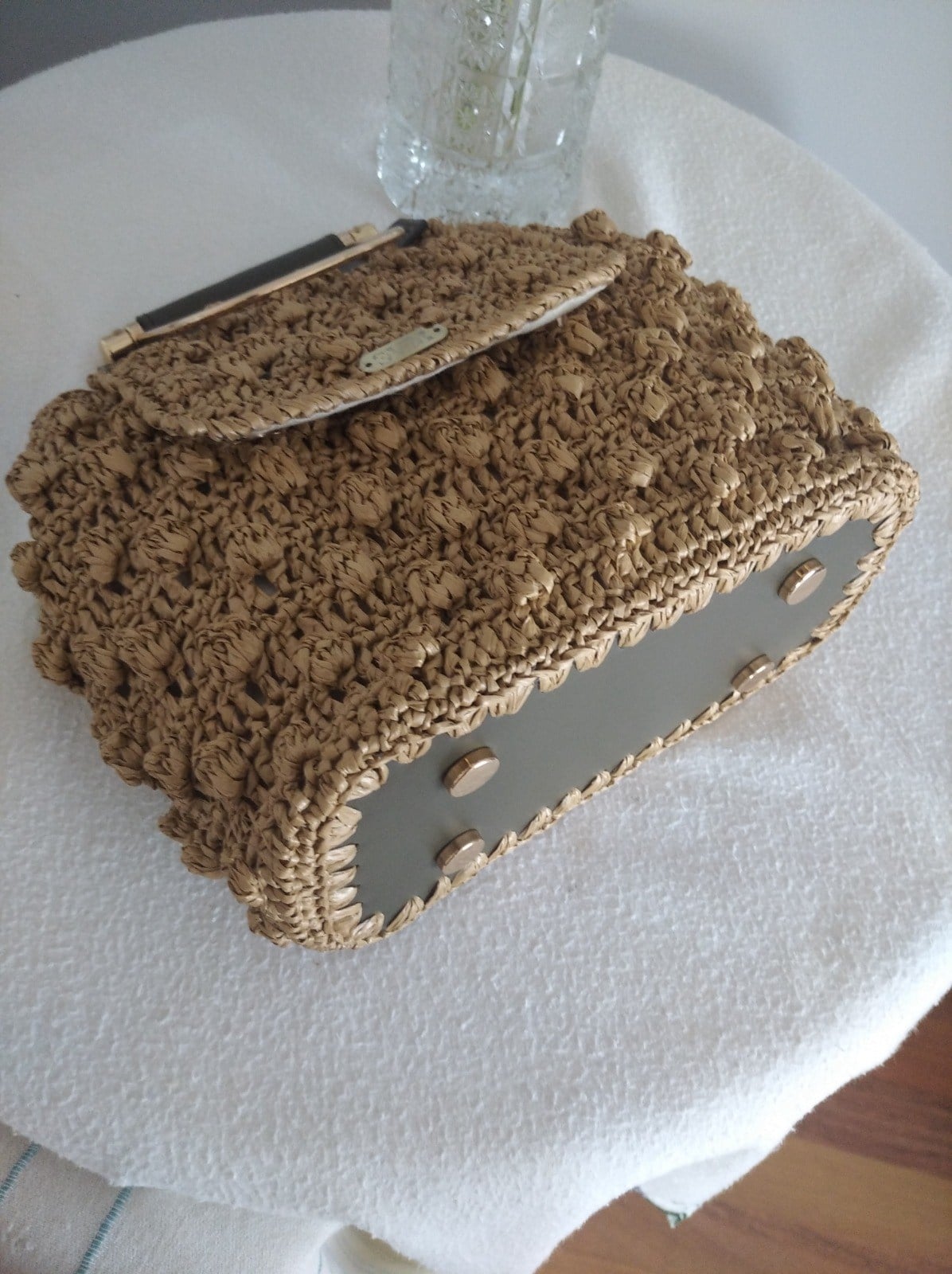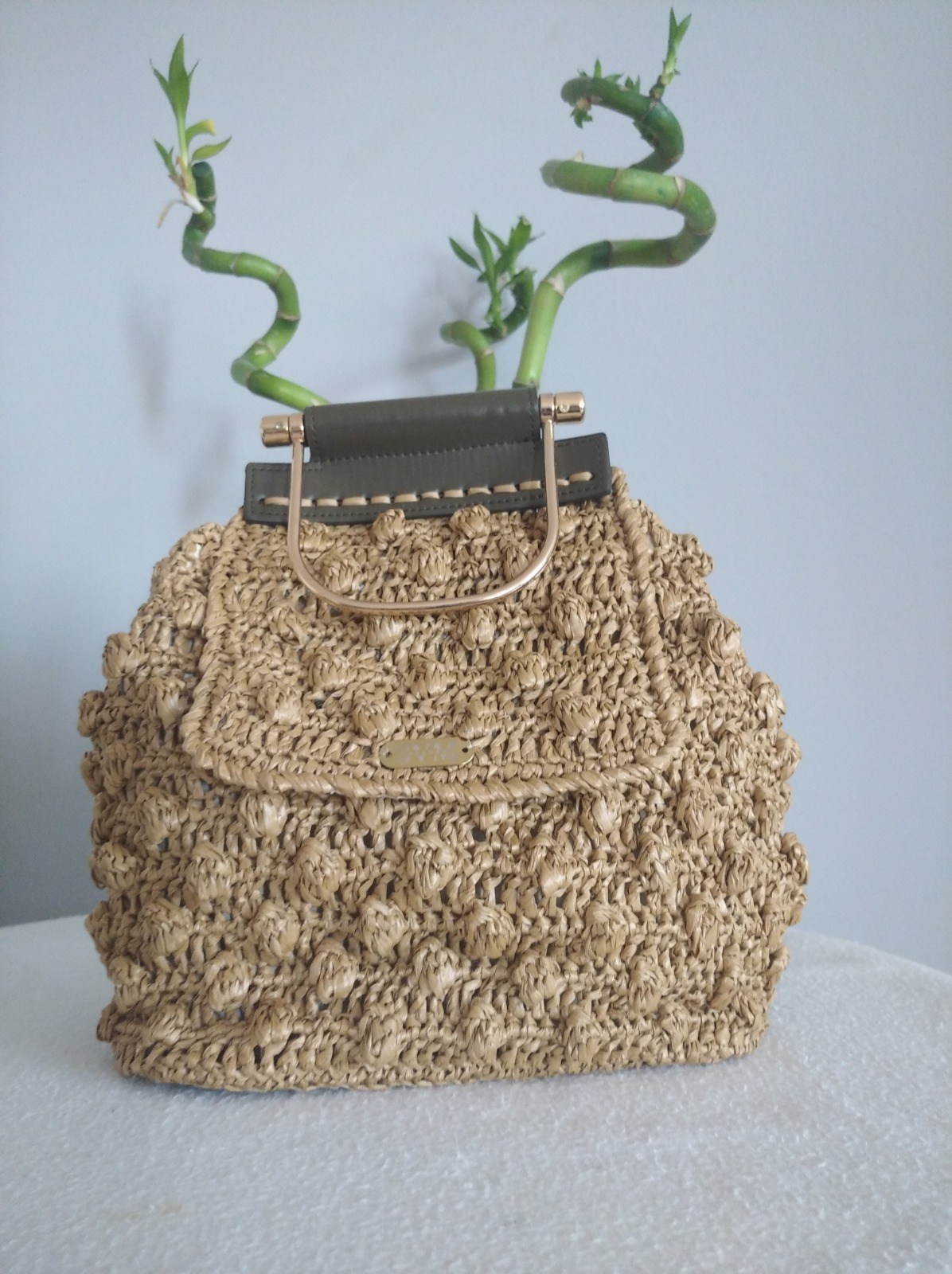 Çanta özel bir rafya ip olan milano rafya ile örülmüştür.Taban haki yeşil hazır tabandır.Sap kısmı ile birlikte satılmaktadır.Özel tasarım bir çantadır.İçi astarlı ,kapama mıknatıslıdır.Ağız kısmında ayrıca bir çıtçıtlı kapama kullanılmıştır.İçi oldukça geniştir.Metal saplı çanta Boy:22cm. En:28 cm. Taban genişliği :10 cm