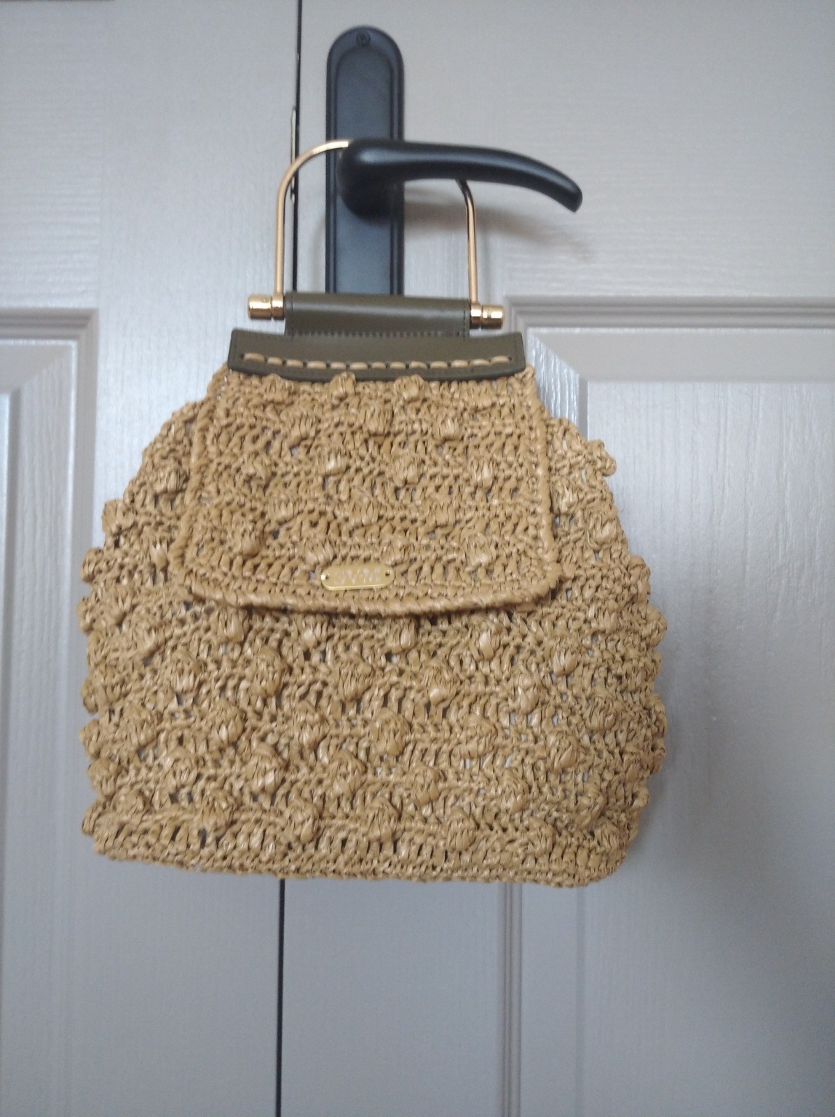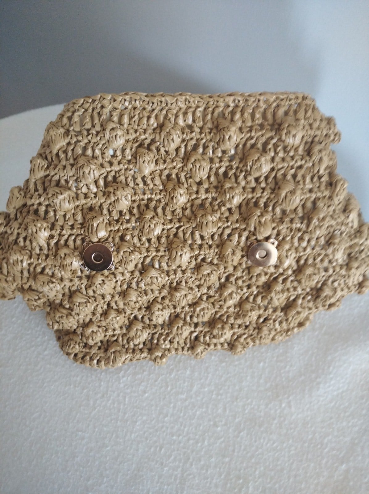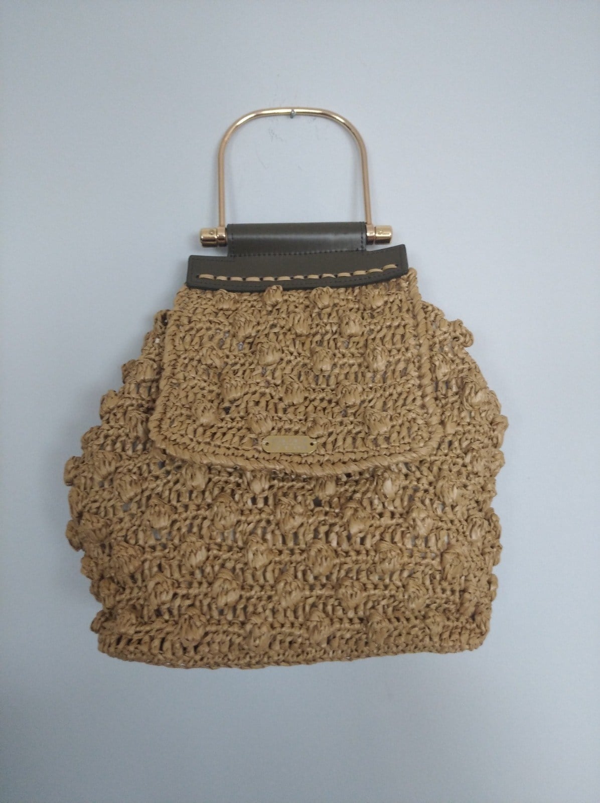 Çanta özel bir rafya ip olan milano rafya ile örülmüştür.Taban haki yeşil hazır tabandır.Sap kısmı ile birlikte satılmaktadır.Özel tasarım bir çantadır.İçi astarlı ,kapama mıknatıslıdır.Ağız kısmında ayrıca bir çıtçıtlı kapama kullanılmıştır.İçi oldukça geniştir.Metal saplı çanta Boy:22cm. En:28 cm. Taban genişliği :10 cm