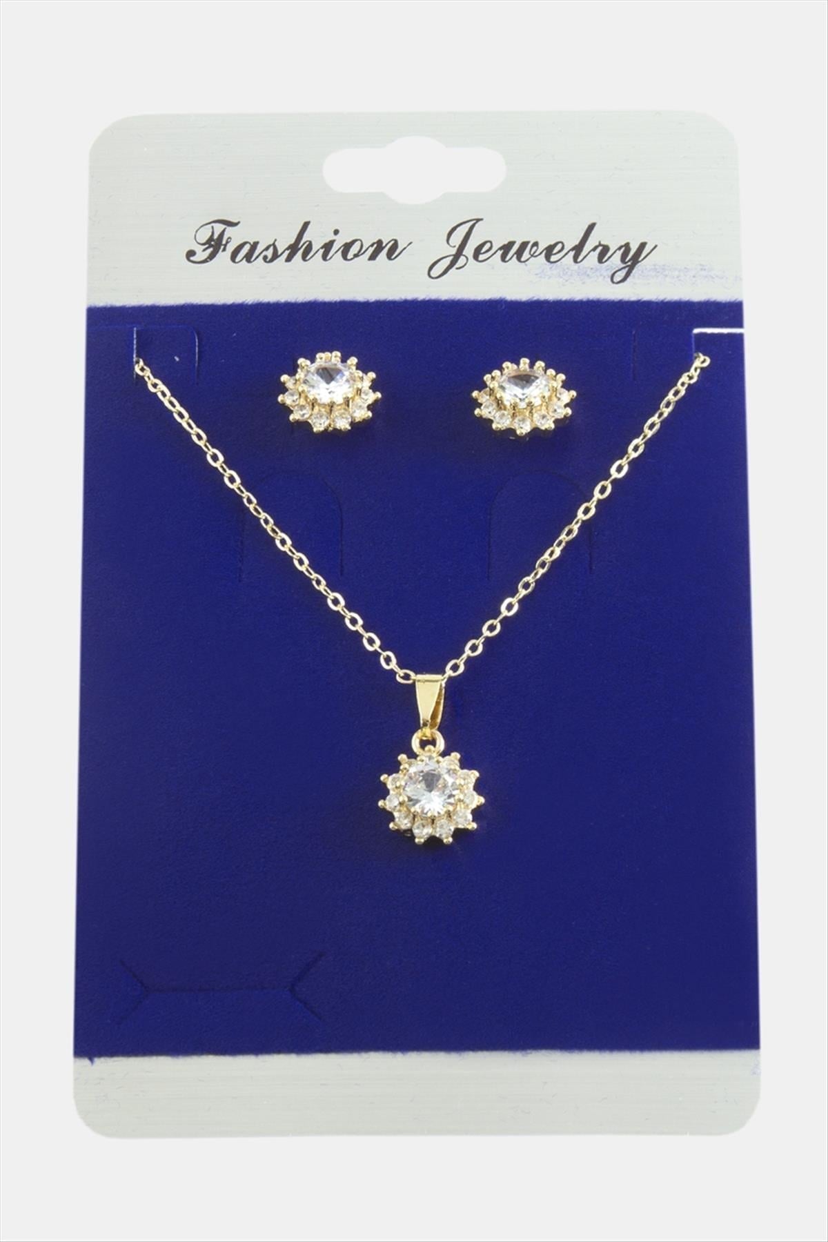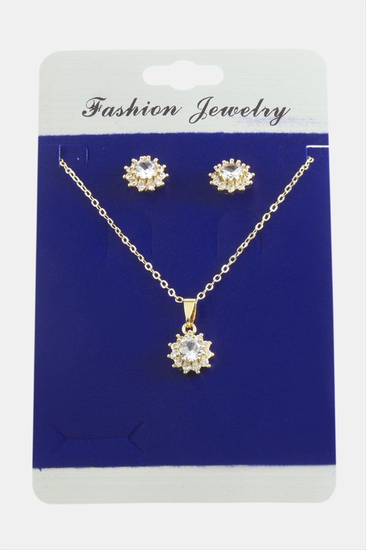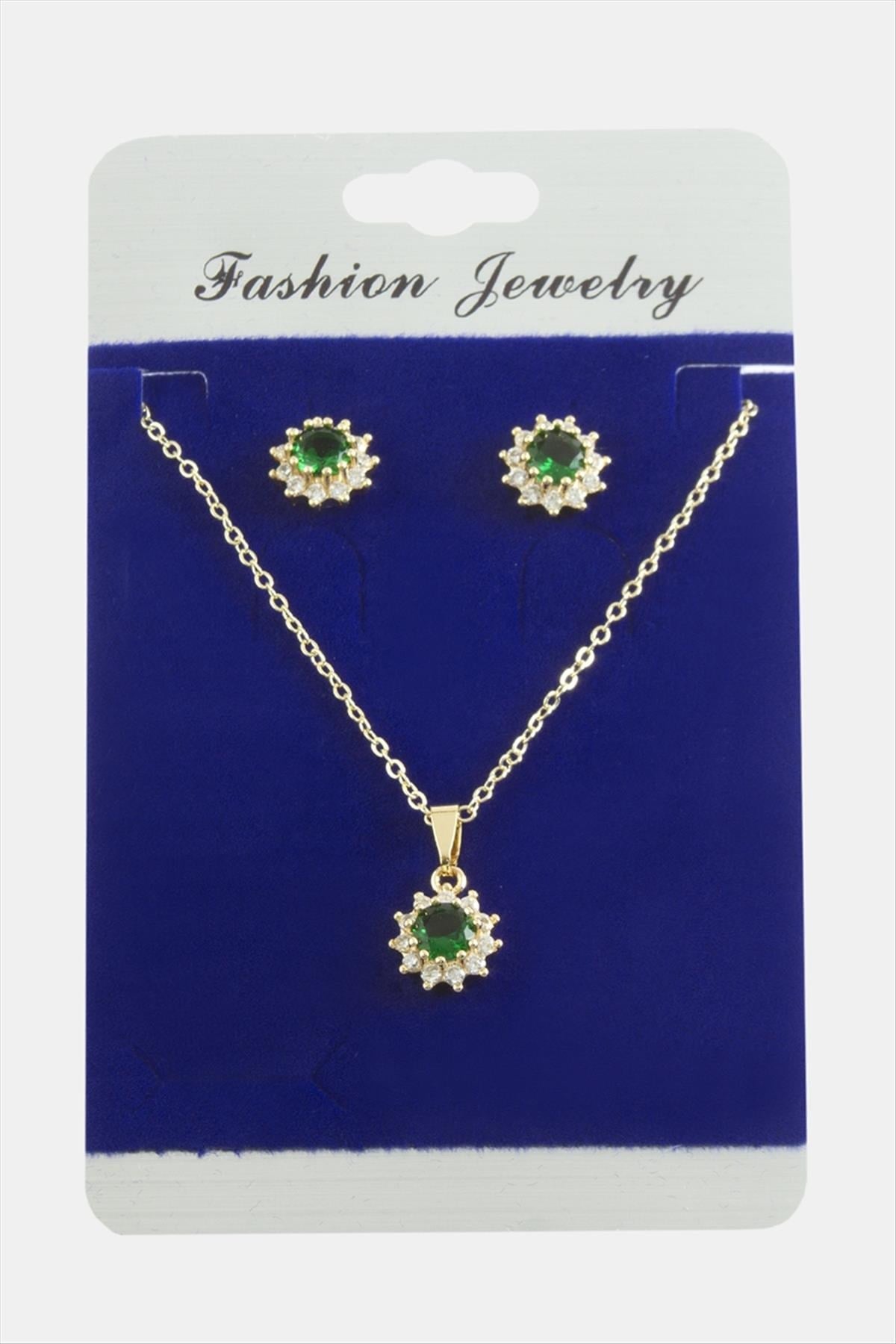 Kolye; Ürün malzemesi metal ve zirkon taştan üretilmiştir. 1 sınıf kaliteli malzeme kullanılmıştır. Ürün 1 adet kolye, ve 1 adet çift küpe vardır. Ürün zincir uzunluğu 45 santimdir. Ürün ucundaki taşlı aparat boyu 1 cmdir.