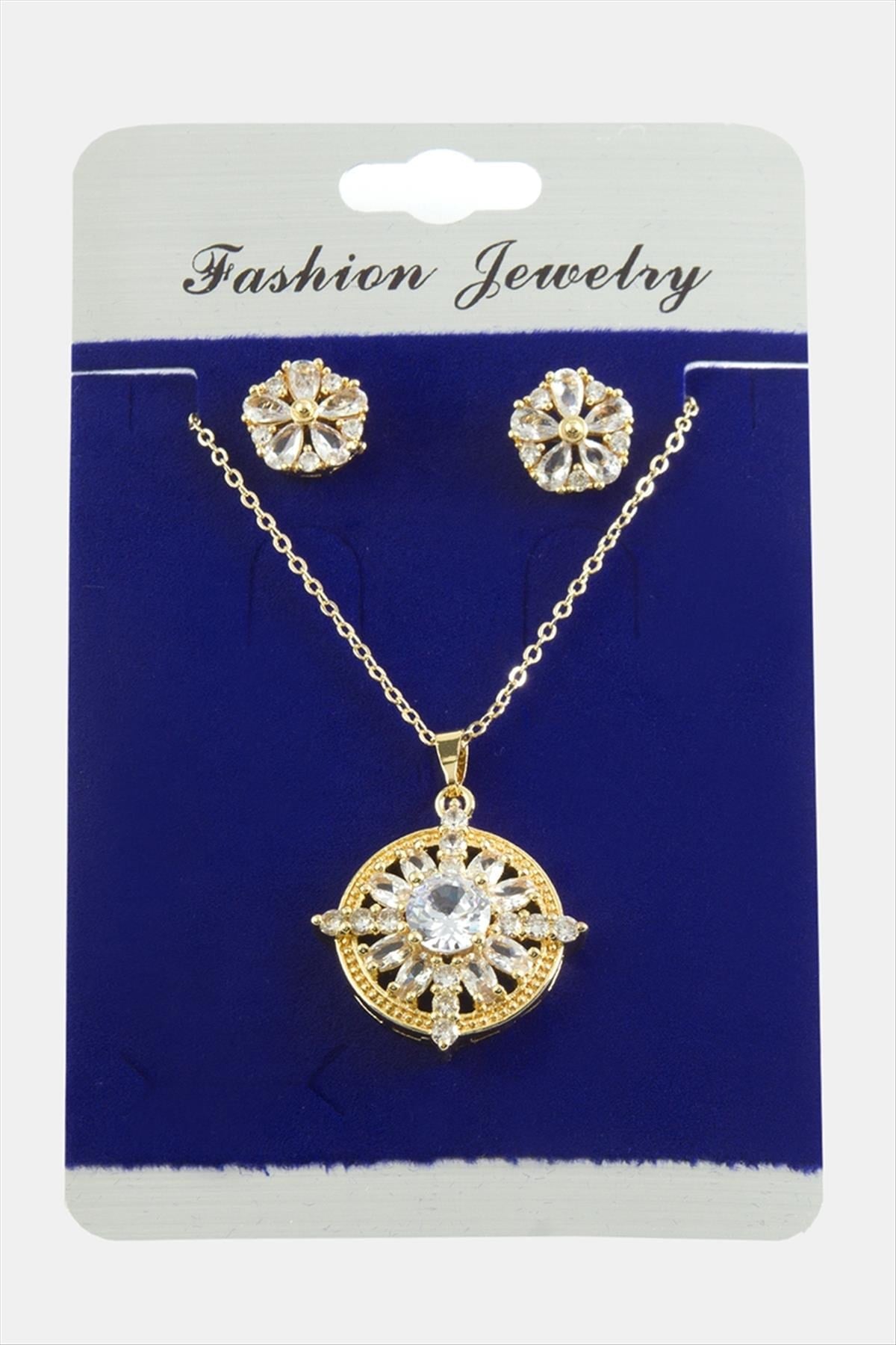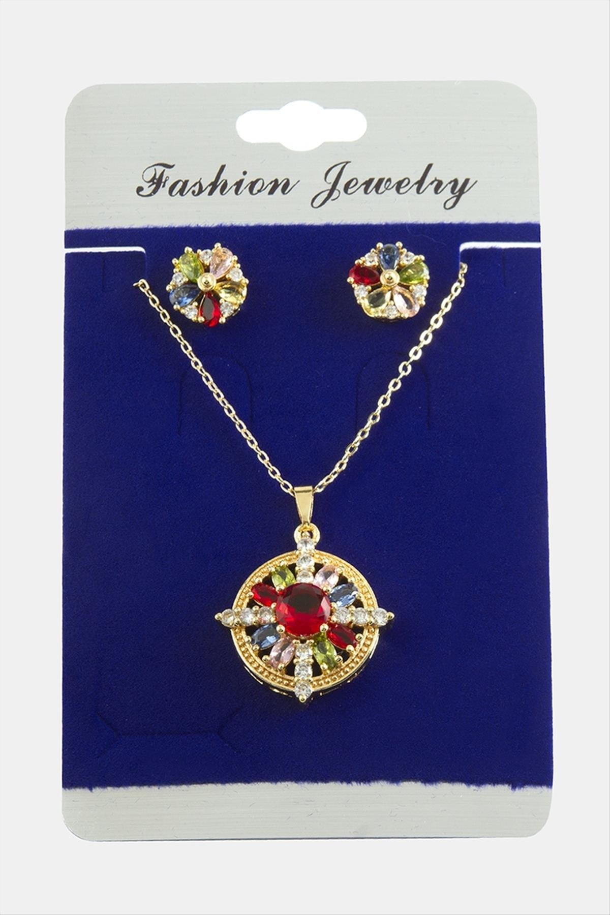 Kolye; Ürün malzemesi metal ve zirkon taştan üretilmiştir. 1 sınıf kaliteli malzeme kullanılmıştır. Ürün 1 adet kolye, ve 1 adet çift küpe vardır. Ürün zincir uzunluğu 45 santimdir. Ürün ucundaki taşlı aparat boyu 2 cmdir.