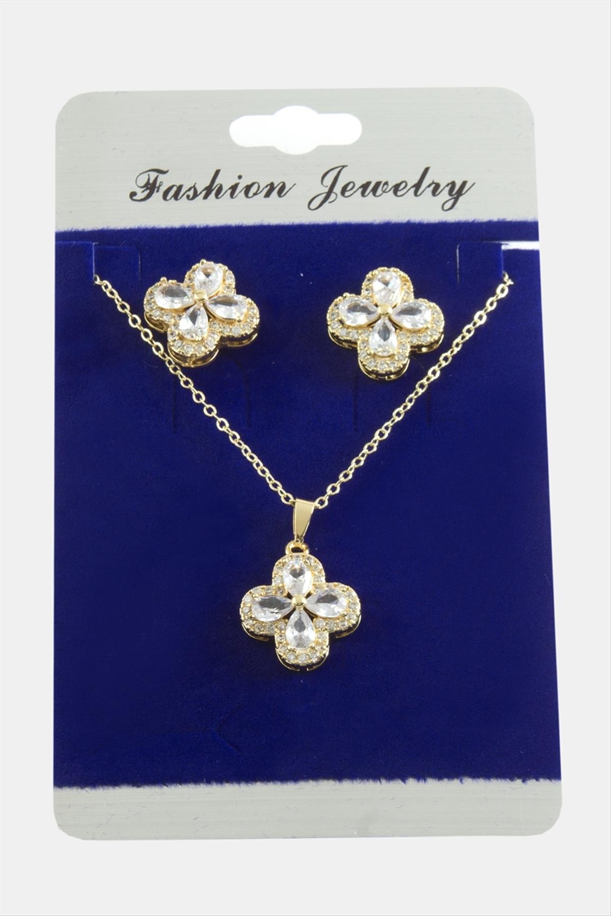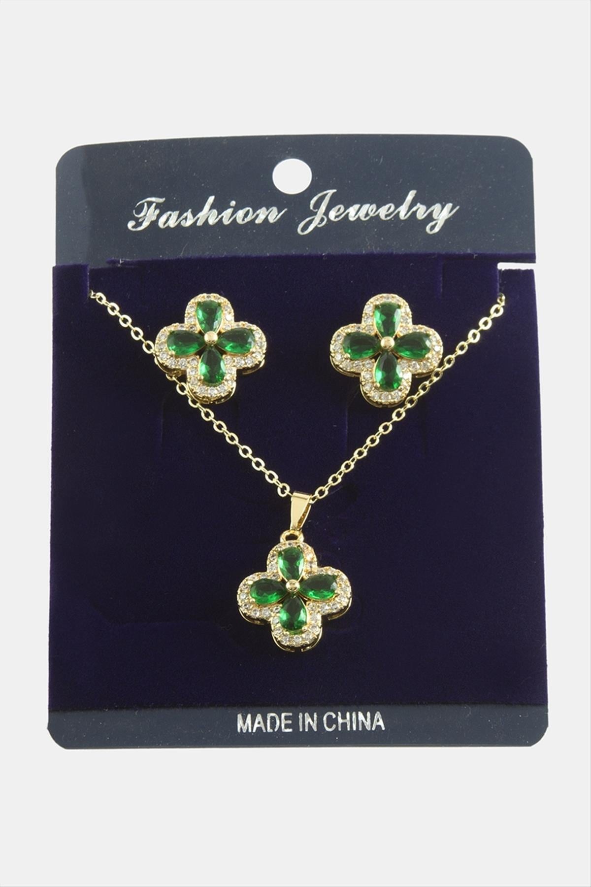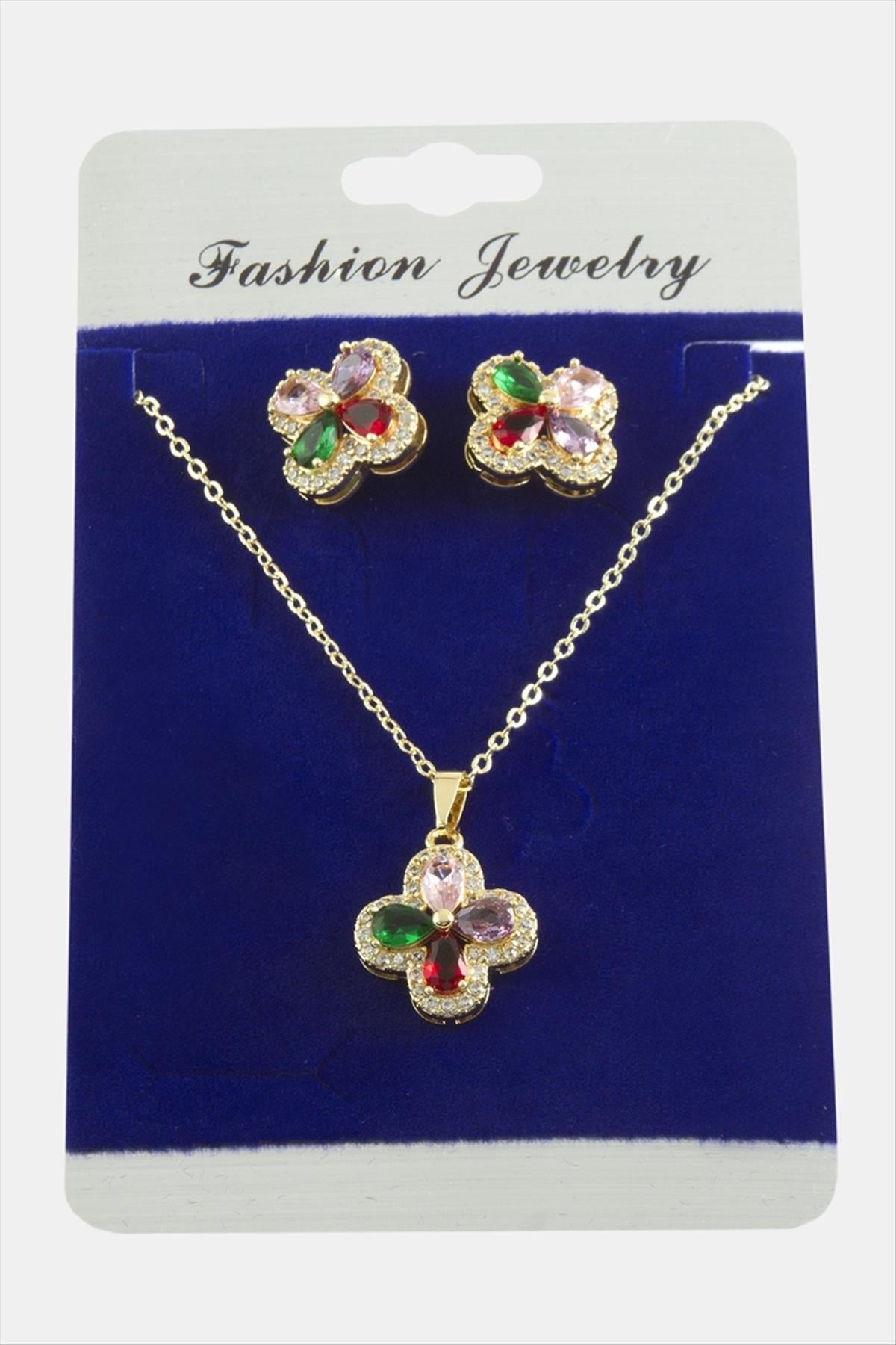 Kolye; Ürün malzemesi metal ve zirkon taştan üretilmiştir. 1 sınıf kaliteli malzeme kullanılmıştır. Ürün 1 adet kolye, ve 1 adet çift küpe vardır. Ürün zincir uzunluğu 45 santimdir. Ürün ucundaki taşlı aparat boyu 1,5 cmdir.