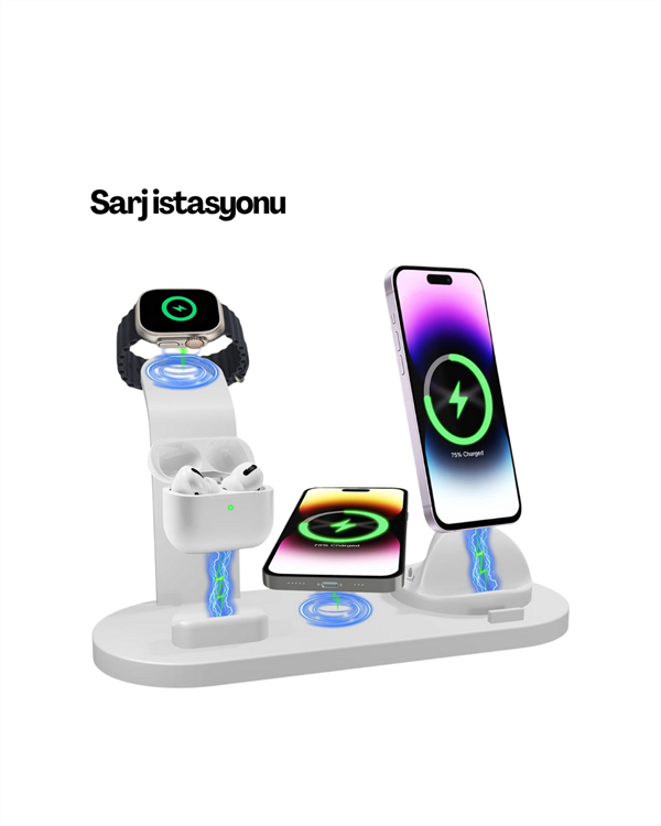 Bu 4’ü 1 arada şarj platformu, günlük yaşamın vazgeçilmezi hâline gelen cihazlarınızı tek bir noktada şarj ederek hem zaman hem de alan tasarrufu sağlar. iPhone, iWatch, AirPods ve farklı girişe sahip diğer cihazları desteklemesi sayesinde hem bireysel hem aile kullanımı için uygundur.Farklı cihazları sırayla değil aynı anda şarj etme imkânı sunan bu ürün, aynı zamanda enerji yönetimi konusunda da akıllı çözümler barındırır. Cihazlar dolduğunda güç akışını dengeler, batarya ömrünü korumaya yardımcı olur.Ofis çalışanları, yoğun seyahat eden kullanıcılar ya da cihazlarını belirli bir düzende saklamak isteyen herkes için ideal bir teknolojik yardımcıdır. Tüm kabloları ortadan kaldıran bu istasyon, günlük hayatı hem pratik hem de daha düzenli hale getirir.