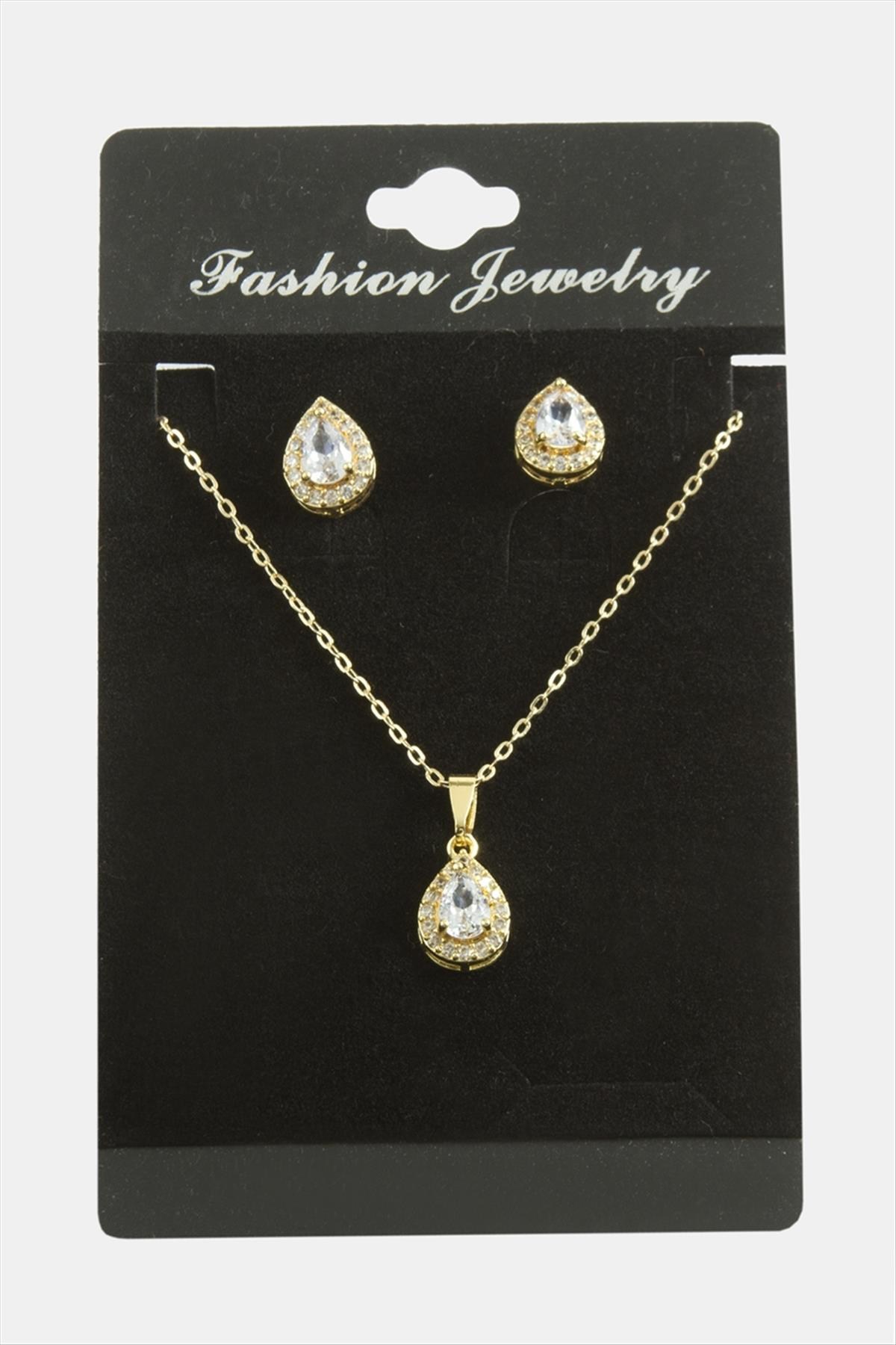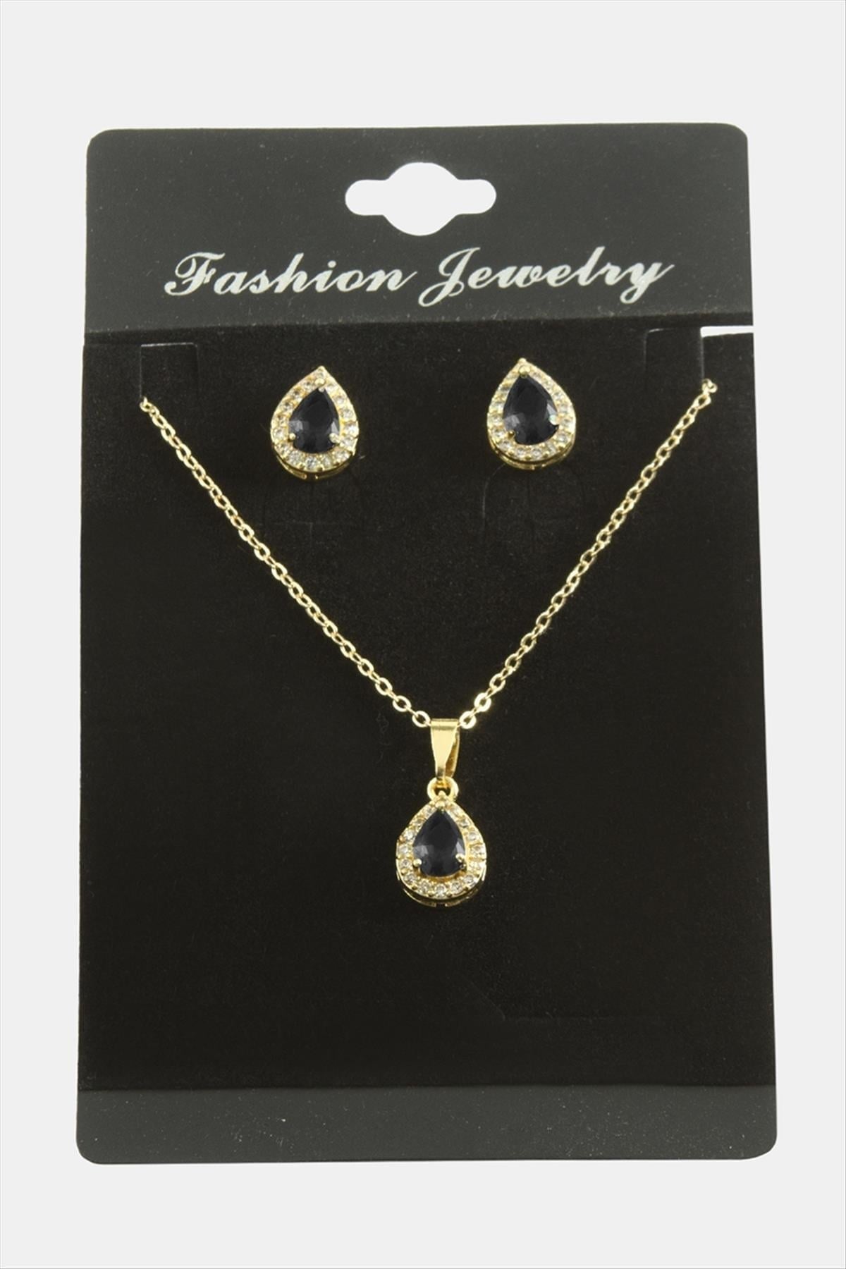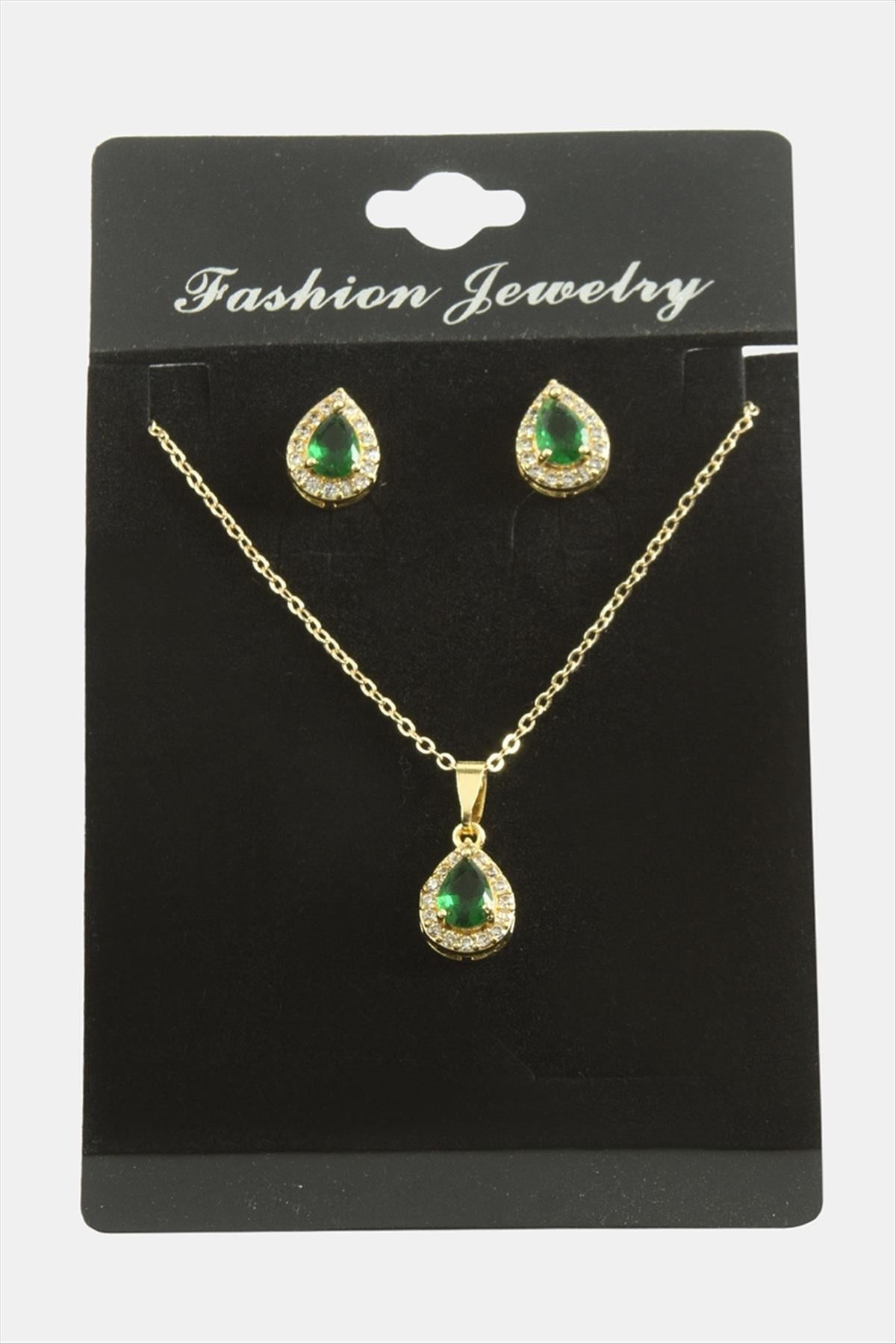 Kolye; Ürün malzemesi metal ve zirkon taştan üretilmiştir. 1 sınıf kaliteli malzeme kullanılmıştır. Ürün 1 adet kolye, ve 1 adet çift küpe vardır. Ürün zincir uzunluğu 45 santimdir. Ürün ucundaki taşlı aparat boyu 1 cmdir.