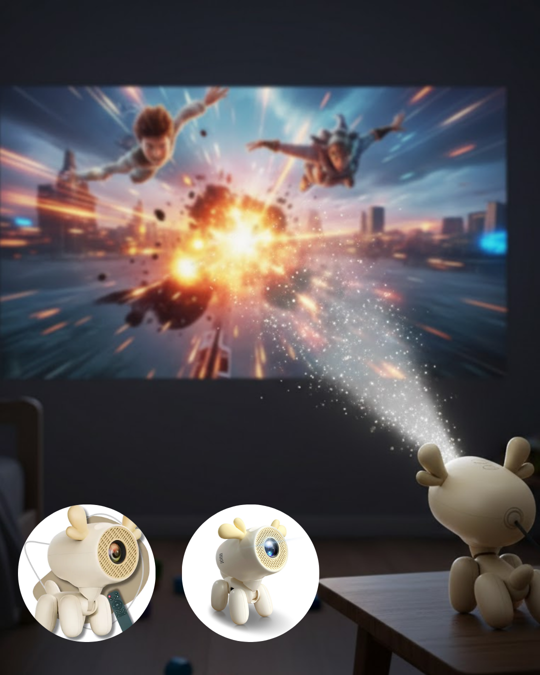 Döner başlıklı akıllı projeksiyon cihazı, yenilikçi tasarımı ve güçlü teknik altyapısı ile ev eğlence deneyimini ileri seviyeye taşır. Sevimli geyik formu sayesinde yalnızca bir projeksiyon cihazı değil, aynı zamanda dekoratif bir obje olarak da kullanılabilir. Kompakt gövde yapısı fazla yer kaplamaz ve entegre stand sistemi sayesinde ek aparat gerektirmeden dengeli şekilde konumlandırılabilir. 180° dönebilen başlık mekanizması, görüntüyü duvara, perdeye veya tavana yönlendirme özgürlüğü sunar. Bu özellik özellikle yatakta uzanarak tavana film izlemek isteyen kullanıcılar için büyük avantaj sağlar. 4K içerik desteği sayesinde yüksek çözünürlüklü medya dosyalarını sorunsuz şekilde oynatabilir. 500 ANSI lümen parlaklık seviyesi, canlı renkler ve net detaylar sunarak yarı karanlık ortamlarda dahi tatmin edici görüntü performansı sağlar. Kontrast dengesi güçlüdür ve animasyon, film ya da sunum içeriklerinde keskinlik hissi verir. Ev sineması deneyimini kompakt bir cihazla yaşamak isteyen kullanıcılar için ideal bir çözümdür. Android tabanlı akıllı sistem sayesinde popüler dijital platformlara doğrudan erişim mümkündür. Ekstra medya oynatıcıya ihtiyaç duyulmaz. Dahili WiFi ile internet bağlantısı sağlanabilir, Bluetooth desteği ile harici hoparlör veya kulaklık bağlanabilir. HDMI, USB ve TF kart girişleri sayesinde bilgisayar, oyun konsolu veya harici depolama cihazlarıyla uyumlu çalışır. 36W gücünde hoparlör sistemi ve Dolby Audio desteği, net ve oda dolduran ses performansı sunar. Ekstra ses sistemi gerektirmeden güçlü bir multimedya deneyimi sağlar.