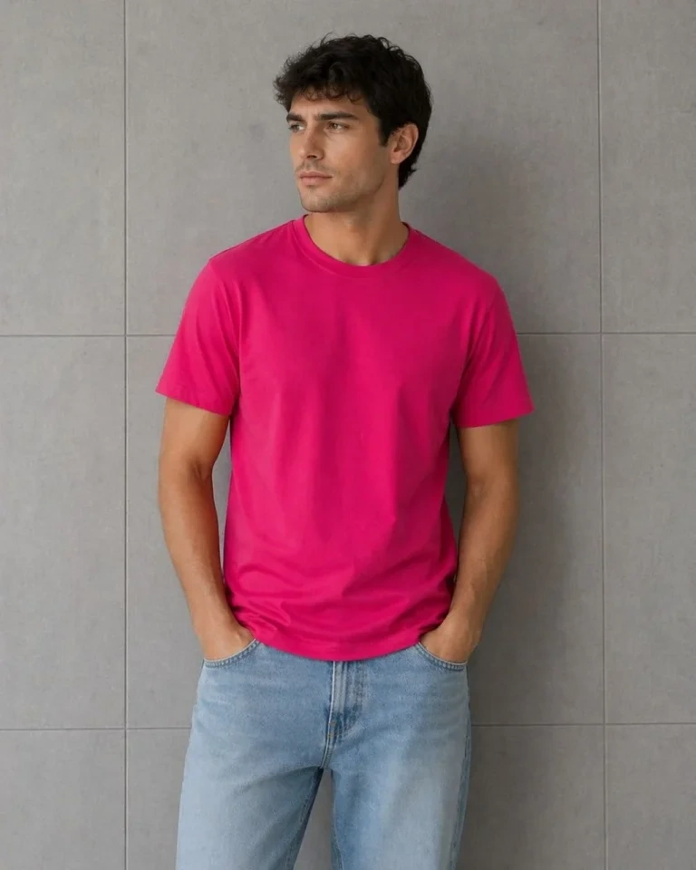 Erkek Basic Pamuklu Tişört Bisiklet Yaka Düz Renk Regular Fit T-Shirt - Fuşya