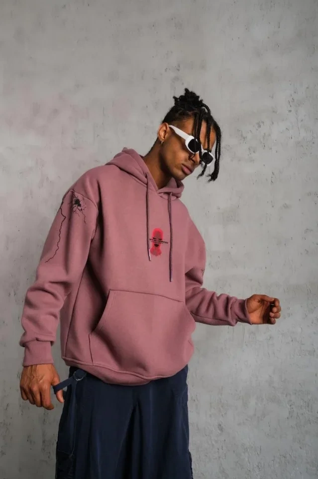 Erkek Maske Baskılı Kapüşonlu Sweat - Gül Kurusu