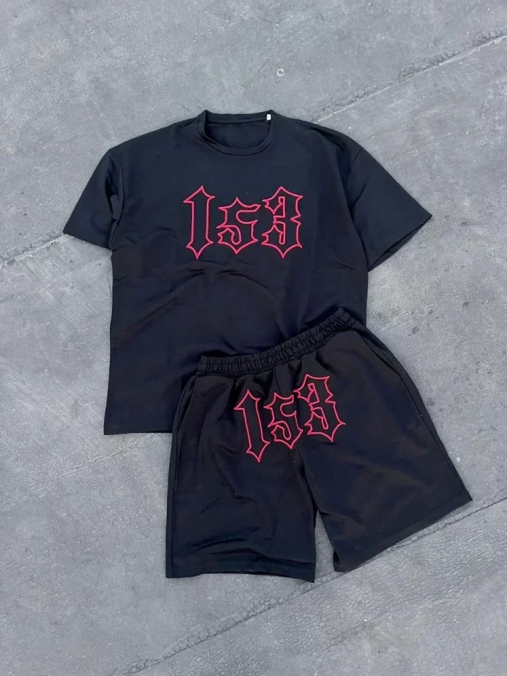Erkek Nakış İşlemeli Şortlu Takım - Siyah