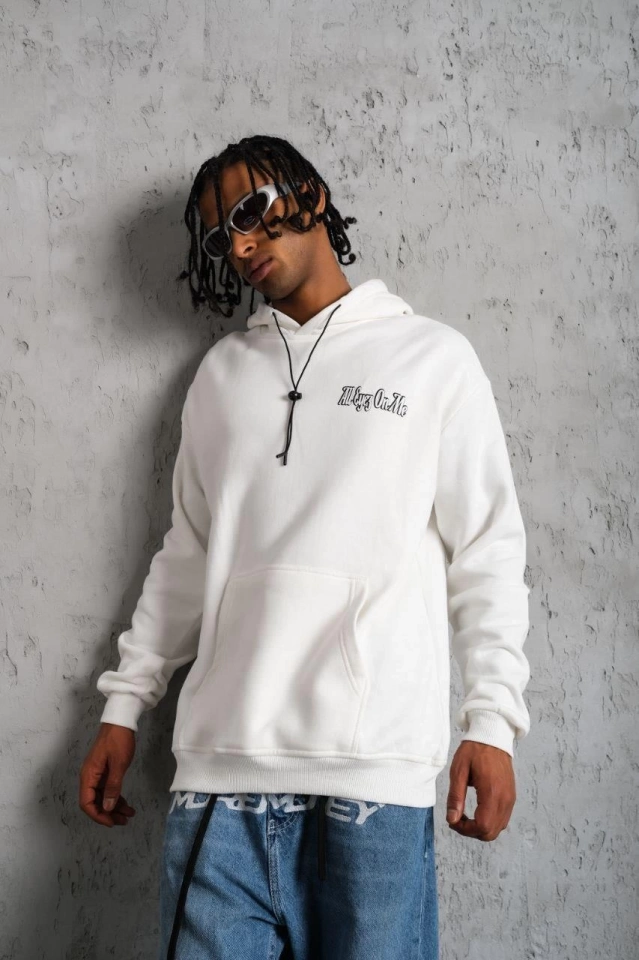 Erkek Oversize Üç İplik Kapüşonlu Sweat – Kol Ve Etek Ribana Detaylı, Ön Ve Sırt Baskılı, Kanguru Cepli Rahat Kalıp Model - Beyaz