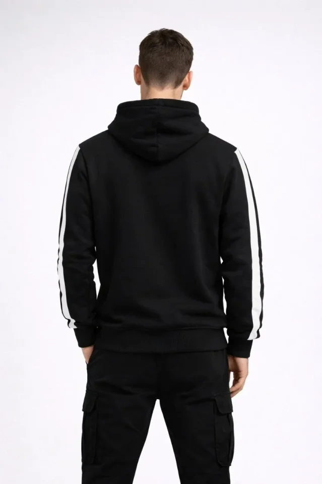 Erkek Şeritli Kapüşonlu Sweatshirt Oversize 3 Iplik Pamuklu - Siyah