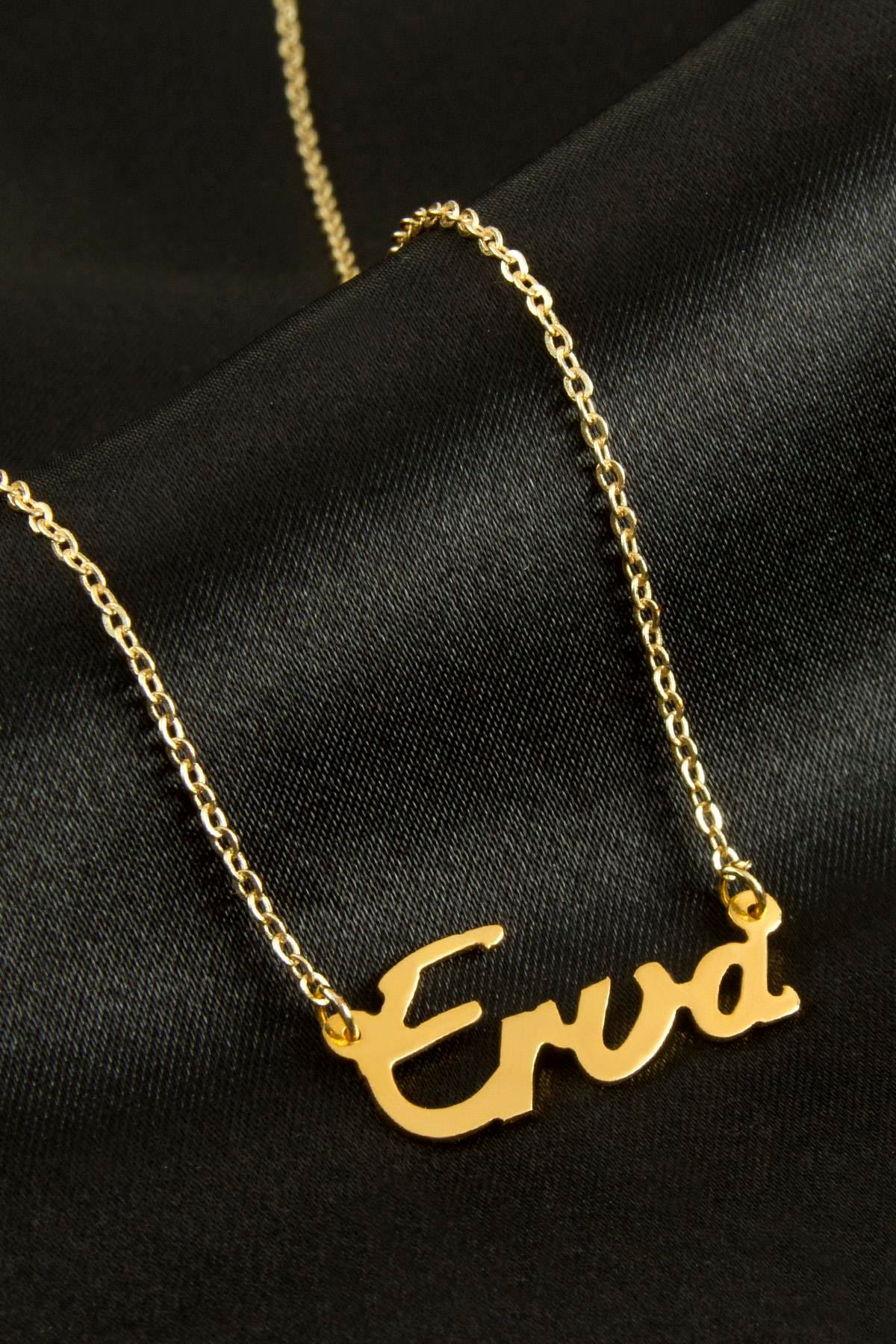 Erva İsimli Kolye. İsimli kolye pirinç madeninden ve altın kaplamalıdır. Kişiye özel üretilmektedir.Yazdırmak istediğiniz ismi bize mesaj olarak iletmeniz gerekmektedir. Kullanıma bağlı olarak uzun süre kullanıma uygundur. Ürün malzemesi 1.sınıf kalitededir. Ürün ve zinciri sarı renktedir. Ürün zincir boyu 45 cm ve ürün üzerindeki isimler yaklaşık 3 cmdir. İsim boyları ürün ismine göre degişiklik göstermektedir.