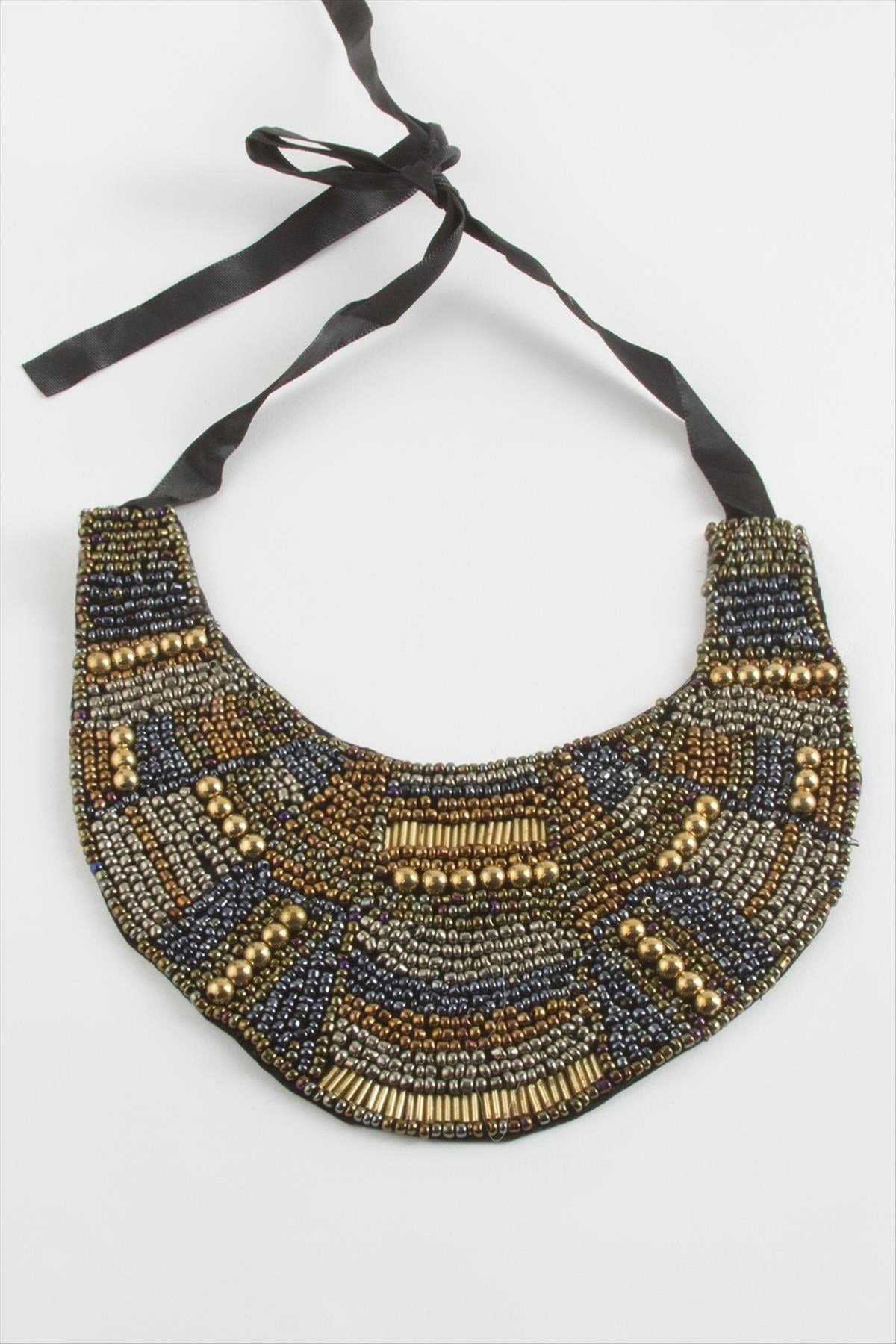 Kolye; Ürün malzemesi boncuk ve kumaştır. Ürün kumaş üzerine dikilerek oluşturulmuştur. Ürün bağlama boyu 60 cmdir. Arkası bağlamalıdır.