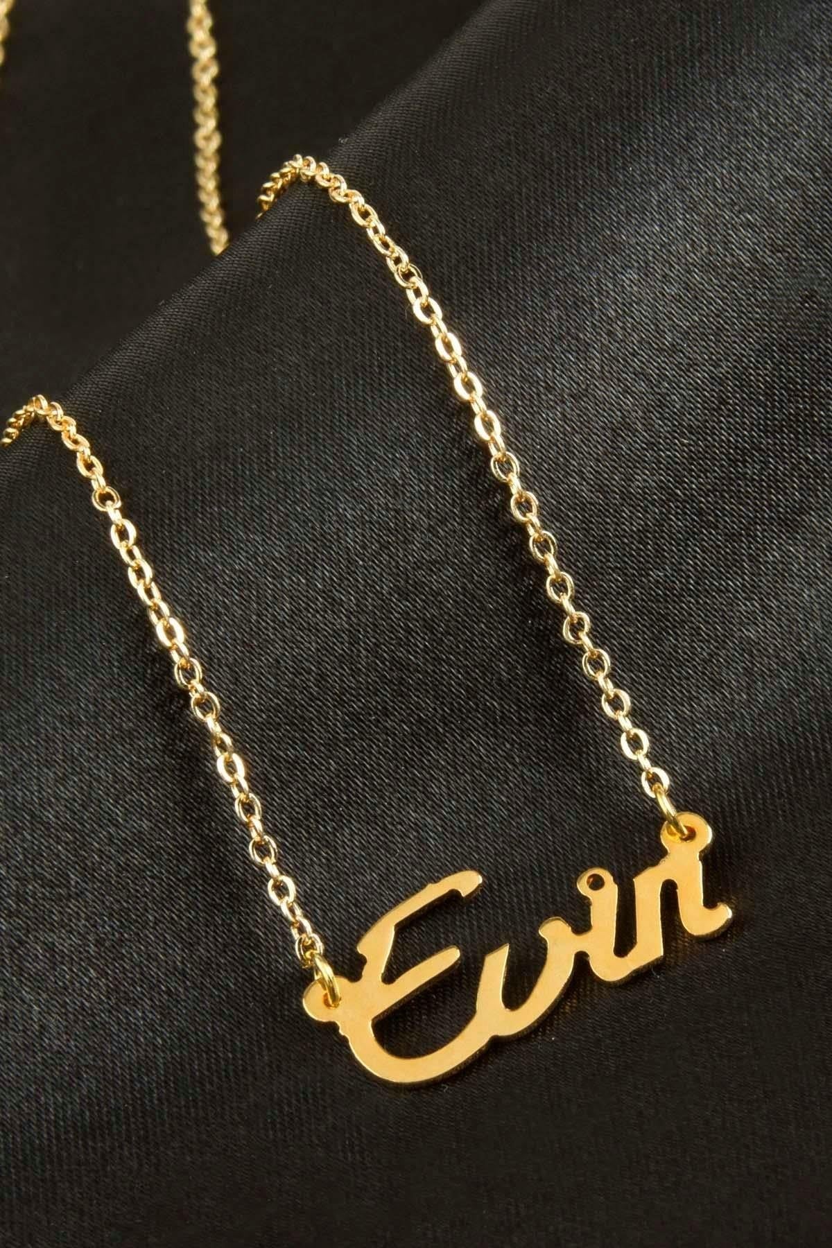 Evin İsimli Kolye. İsimli kolye pirinç madeninden ve altın kaplamalıdır. Kişiye özel üretilmektedir.Yazdırmak istediğiniz ismi bize mesaj olarak iletmeniz gerekmektedir. Kullanıma bağlı olarak uzun süre kullanıma uygundur. Ürün malzemesi 1.sınıf kalitededir. Ürün ve zinciri sarı renktedir. Ürün zincir boyu 45 cm ve ürün üzerindeki isimler yaklaşık 3 cmdir. İsim boyları ürün ismine göre degişiklik göstermektedir.