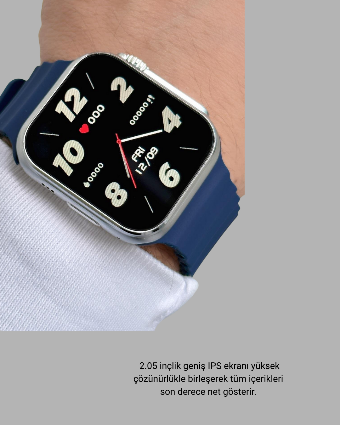 Bu akıllı saat, modern tasarımı ve gelişmiş özellikleri ile günlük yaşamı organize etmek ve sağlık takibini kolaylaştırmak isteyenler için kapsamlı bir çözüm sunar. 2.05 inçlik geniş IPS ekranı yüksek çözünürlükle birleşerek tüm içerikleri son derece net gösterir. 2.5D kavisli cam, saate hem zarif bir görünüm kazandırır hem de dayanıklılığı artırır. Metal alaşımlı gövde yapısı sağlam bir kullanım sunarken silikon kayış günlük yaşamda bileğe konforlu bir uyum sağlar. Yaklaşık 50 gram ağırlığındaki hafif yapısı ile uzun süre bilekte kaldığında rahatsız etmez. Üç yan tuş, pratik kullanım deneyimi için tasarlanmıştır. IP67 su geçirmezlik özelliği, gündelik kullanımda su sıçramalarına ve terlemeye karşı koruma sunar. Sağlık özellikleri arasında 24 saat kalp atış hızı ölçümü, oksijen seviyesi analizi, tansiyon ölçümü, adım ölçer, kalori takibi ve uyku analizi gibi birçok gelişmiş sensör yer alır. Uyku monitörü; hafif uyku, derin uyku ve toplam uyku süresini ölçerek daha bilinçli bir uyku düzeni oluşturmanızı sağlar. Bluetooth arama özelliği sayesinde telefon görüşmelerini direkt saat üzerinden gerçekleştirebilirsiniz. Spor modları yürüyüş, koşu, bisiklet ve daha birçok aktiviteyi ölçerek spor performansınızı takip etmenize yardımcı olur. Müzik kontrolü, hava durumu, telefon bulma, takvim, mesaj bildirimleri, alarm ve zamanlayıcı gibi birçok fonksiyon günlük yaşamı kolaylaştırır. 360 mAh bataryası günlük kullanımda 3–5 gün çalışabilir ve 7 güne kadar bekleme süresi sunar. Şık tasarımı, büyük ekranı, güçlü sağlık takip sistemleri ve Bluetooth arama özelliği ile bu akıllı saat hem iş hem spor hem de günlük kullanım için ideal bir teknolojik yardımcıdır.