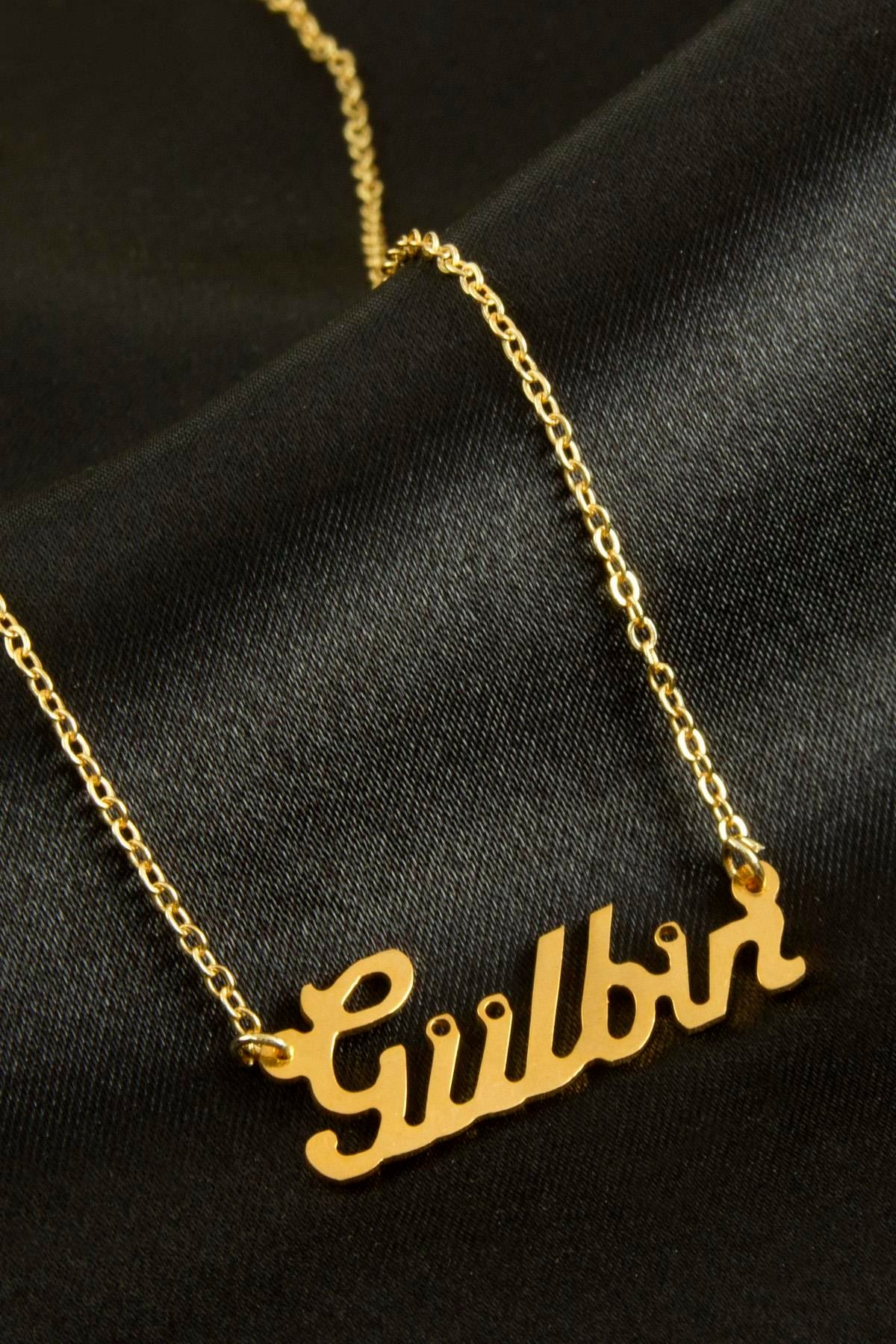 Gülbin İsimli Kolye. İsimli kolye pirinç madeninden ve altın kaplamalıdır. Kişiye özel üretilmektedir.Yazdırmak istediğiniz ismi bize mesaj olarak iletmeniz gerekmektedir. Kullanıma bağlı olarak uzun süre kullanıma uygundur. Ürün malzemesi 1.sınıf kalitededir. Ürün ve zinciri sarı renktedir. Ürün zincir boyu 45 cm ve ürün üzerindeki isimler yaklaşık 3 cmdir. İsim boyları ürün ismine göre degişiklik göstermektedir.