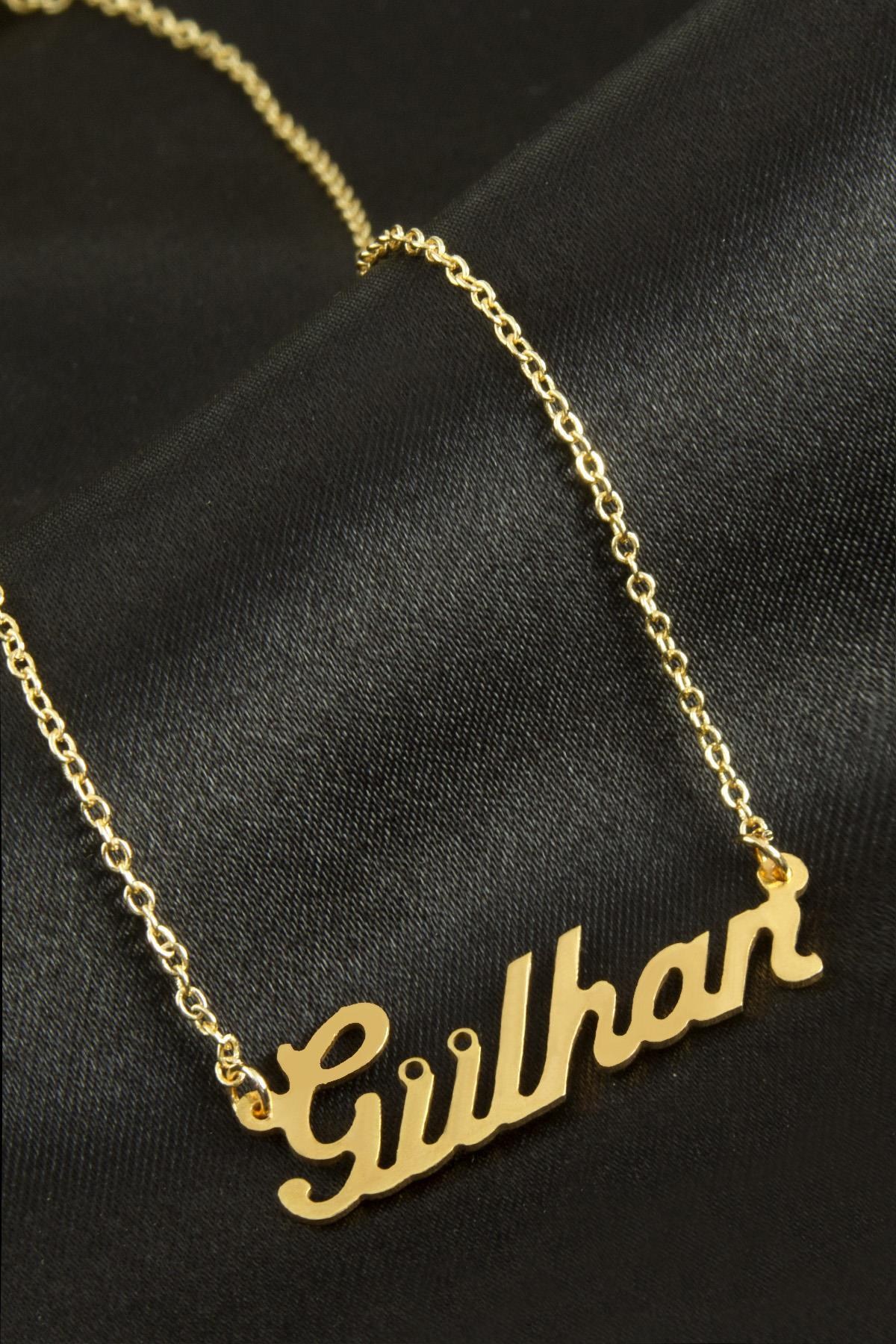 Gülhan İsimli Kolye. İsimli kolye pirinç madeninden ve altın kaplamalıdır. Kişiye özel üretilmektedir.Yazdırmak istediğiniz ismi bize mesaj olarak iletmeniz gerekmektedir. Kullanıma bağlı olarak uzun süre kullanıma uygundur. Ürün malzemesi 1.sınıf kalitededir. Ürün ve zinciri sarı renktedir. Ürün zincir boyu 45 cm ve ürün üzerindeki isimler yaklaşık 3 cmdir. İsim boyları ürün ismine göre degişiklik göstermektedir.