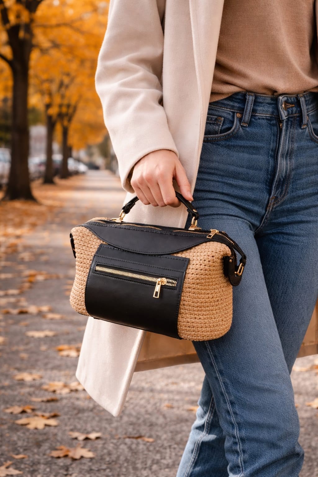 Özel Milano rafya ip kullanılarak tamamen el emeği ile örülen kahverengi deri detaylı bej rafya çanta, zarif ve doğal tasarımıyla günlük kombinlerinizi tamamlayan şık bir modeldir. Modern görünümü sayesinde hem günlük kullanımda hem de ofis stilinde rahatlıkla tercih edilebilir.