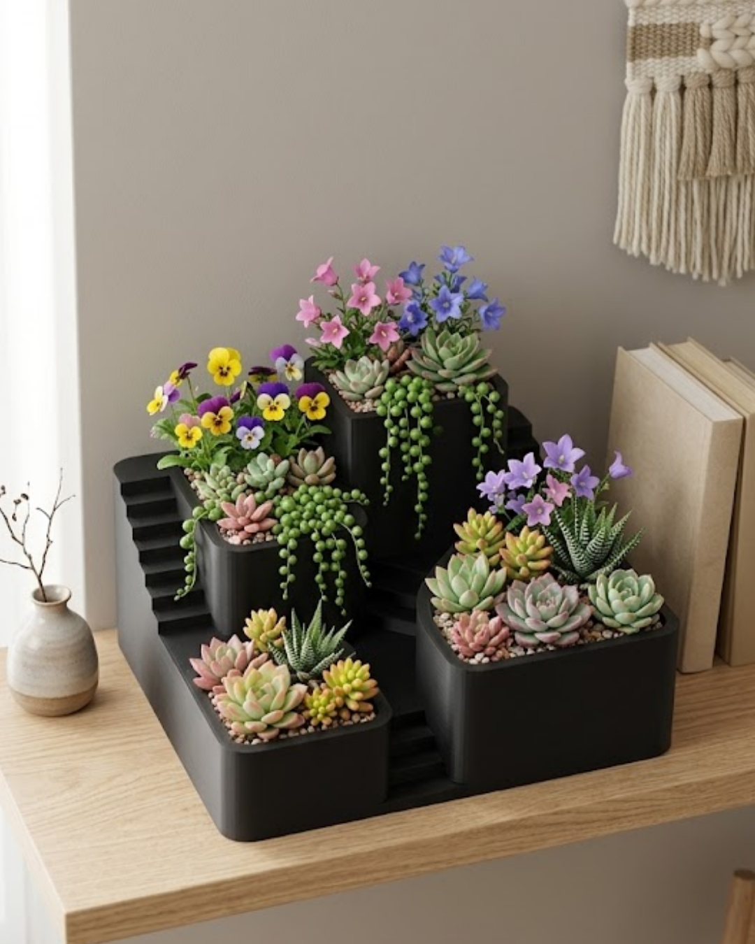 3D kaktüs saksı organizer, fonksiyonel tasarımı ile bitkilerinizi düzenli bir şekilde sergilemenizi sağlar. Çoklu bölmeli yapısı sayesinde farklı bitkileri tek bir platformda bir araya getirir ve estetik bir düzen oluşturur. Özellikle küçük alanlarda maksimum verim sağlamak isteyen kullanıcılar için idealdir. Modern ve sade tasarımı sayesinde her ortamda rahatlıkla kullanılabilir. Çalışma masasında kullanıldığında hem motivasyonu artırır hem de ortama doğal bir enerji katar. Aynı zamanda dekoratif bir obje olarak da kullanılabilir. Ürün, 3D baskı teknolojisi ile üretilmiştir ve bu sayede hem hafif hem de dayanıklıdır. Uzun süreli kullanım için uygundur. Katmanlı yüzey dokusu ürüne özgün bir görünüm kazandırır. Bitkilerinizin daha düzenli görünmesini sağlar ve bakım sürecini kolaylaştırır. Ayrıca taşınabilir yapısı sayesinde istediğiniz alana kolaylıkla yerleştirebilirsiniz. Anahtar kelimeler: 3D saksı organizer, masaüstü saksı, bitki standı, kaktüs saksı