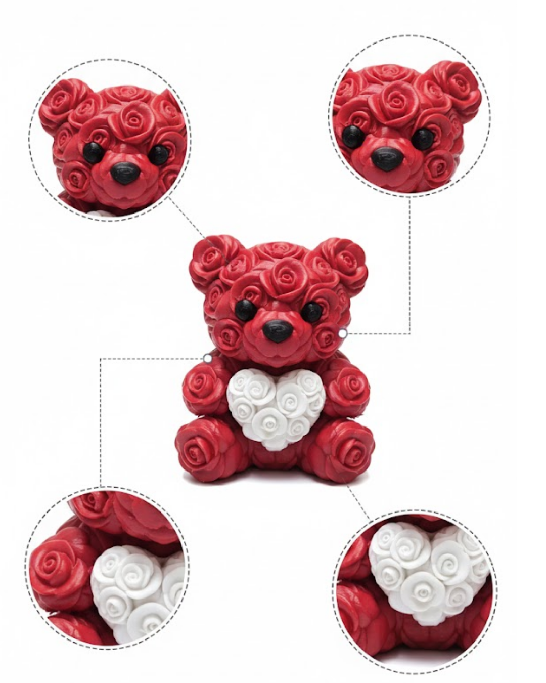 Bu 3D baskı kalp ayıcık, romantik ve şık tasarımıyla özel günlerin vazgeçilmez hediyesi olmaya adaydır. 10 cm boyutuyla minimal ama etkileyici bir dekor sunar. Gül detayları ve kalp figürü ile sevgi temasını estetik biçimde yansıtır.