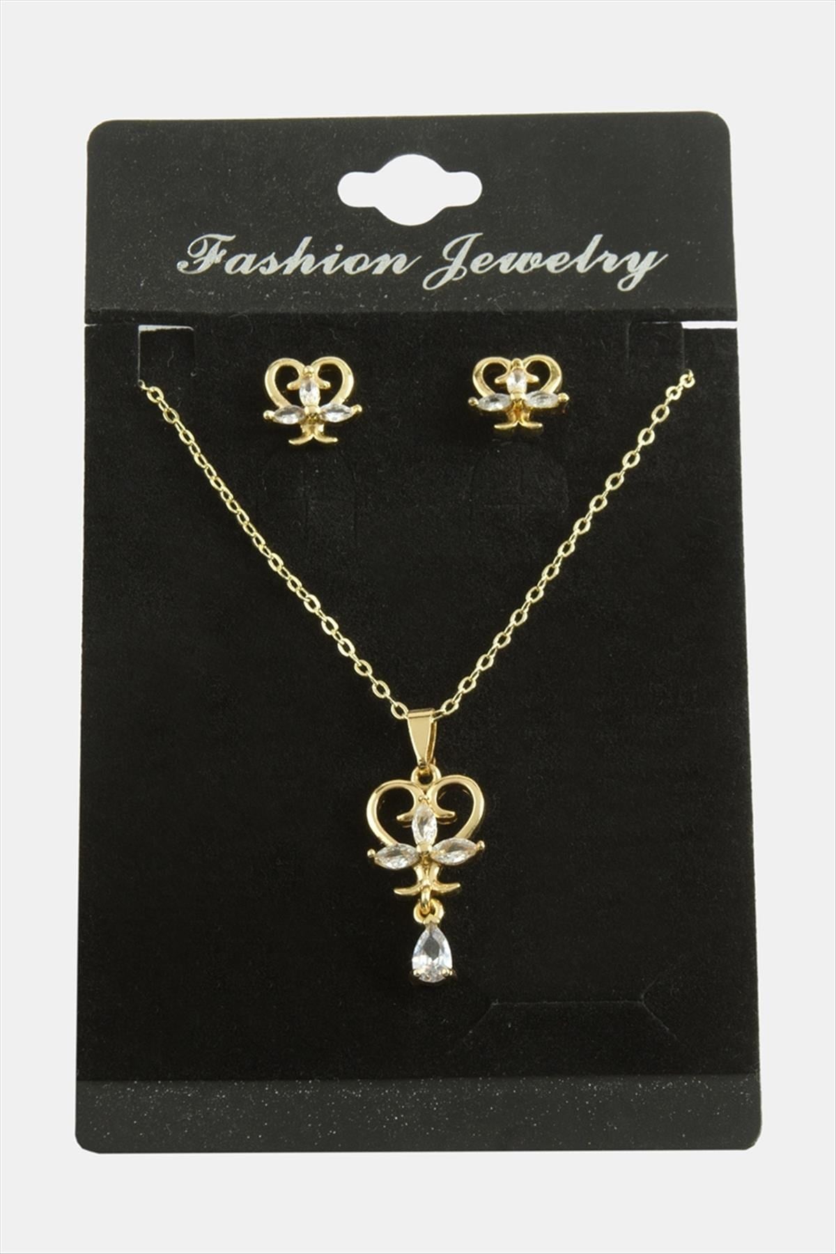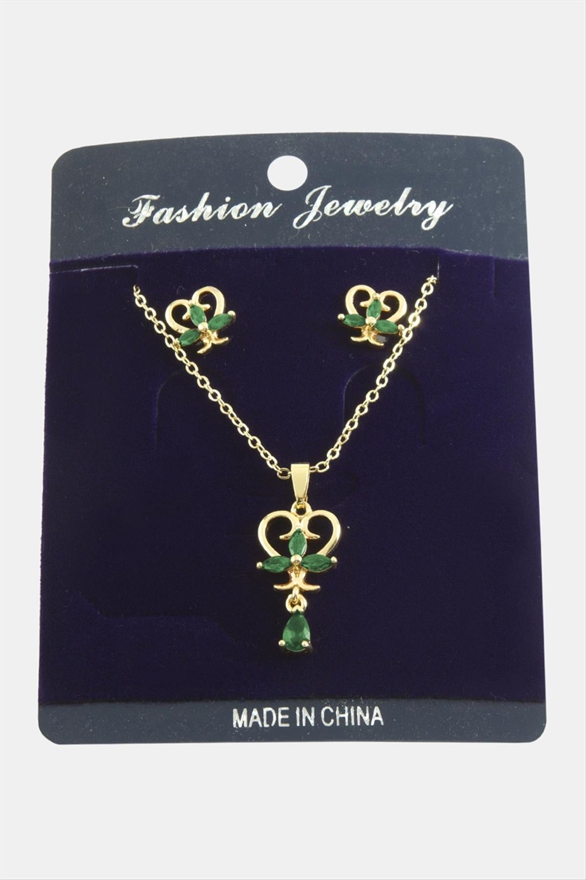Kolye; Ürün malzemesi metal ve zirkon taştan üretilmiştir. 1 sınıf kaliteli malzeme kullanılmıştır. Ürün 1 adet kolye, ve 1 adet çift küpe vardır. Ürün zincir uzunluğu 45 santimdir. Ürün ucundaki taşlı aparat boyu 2 cmdir.