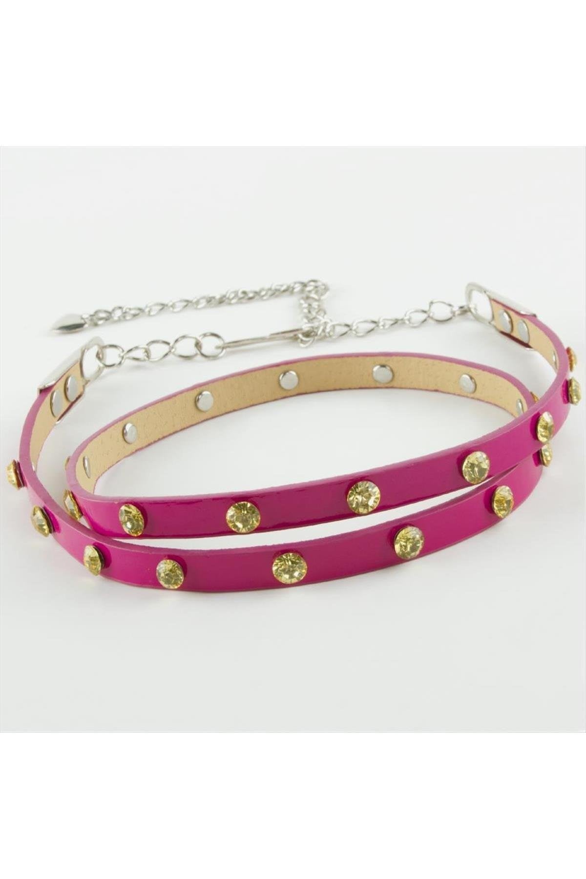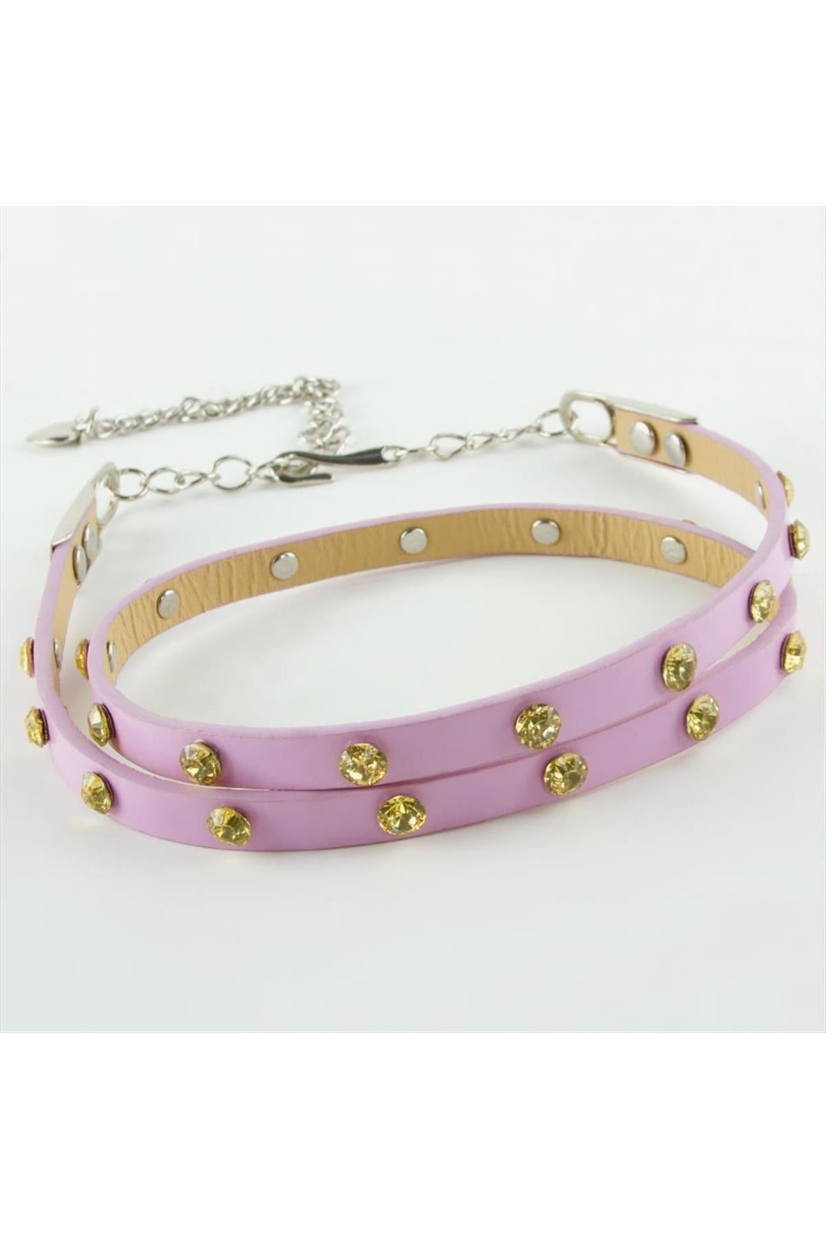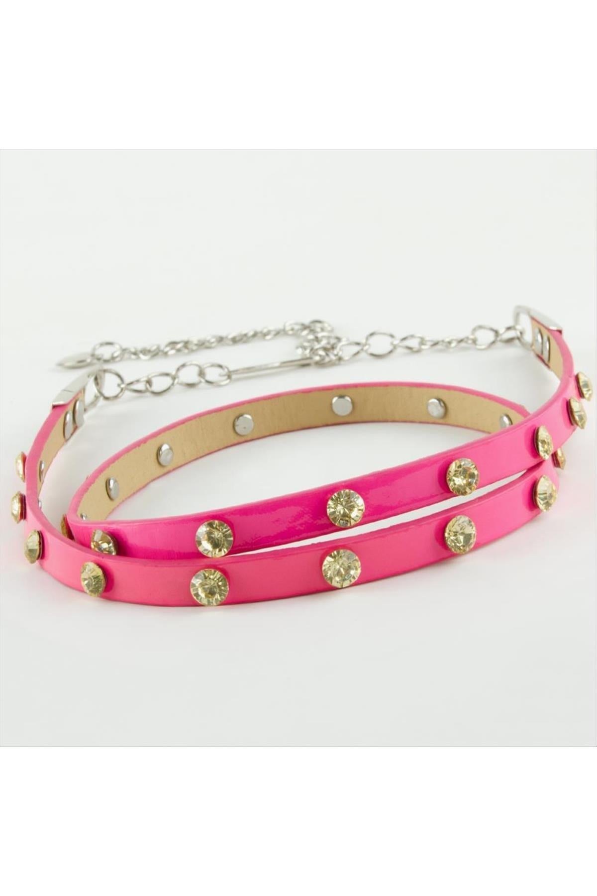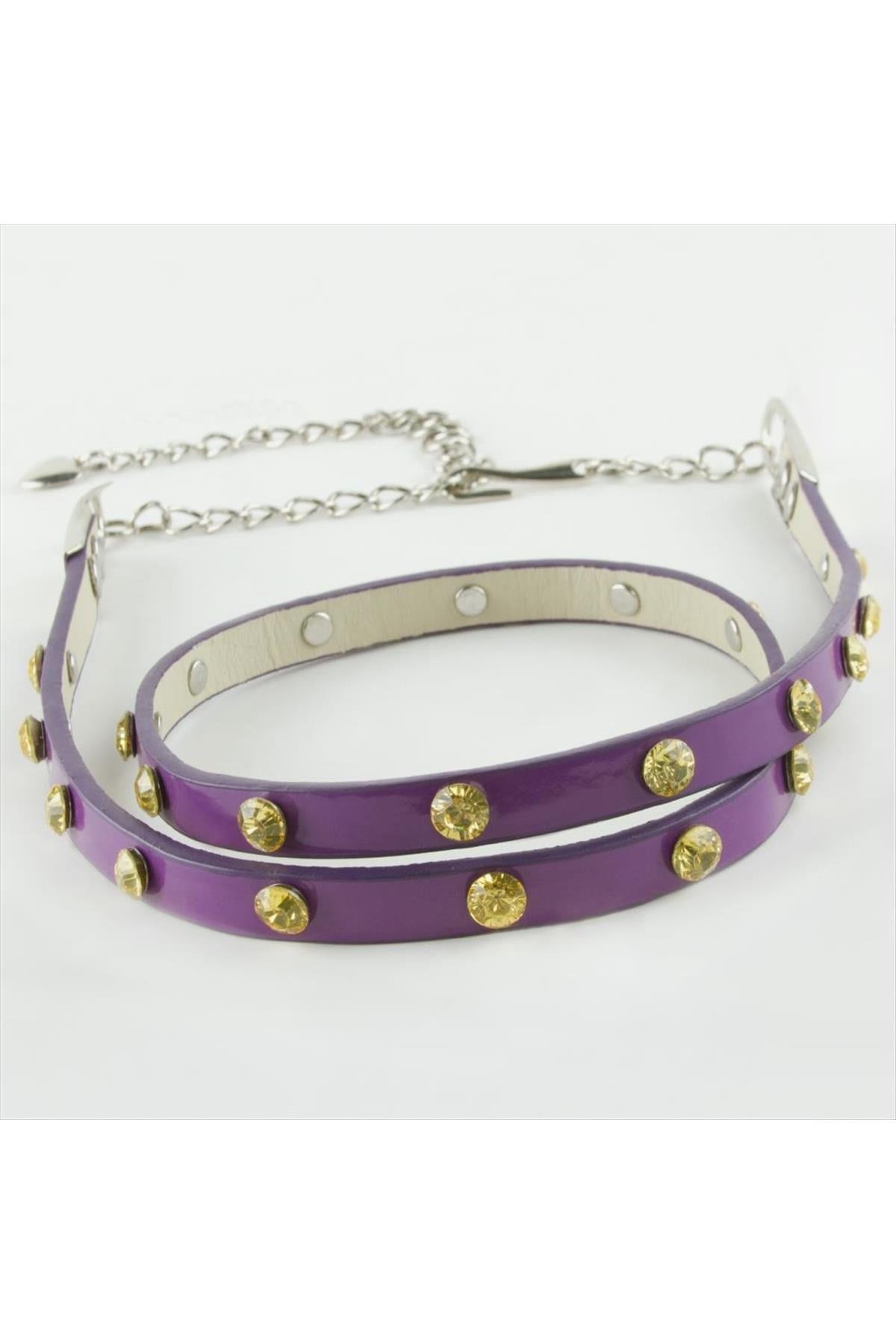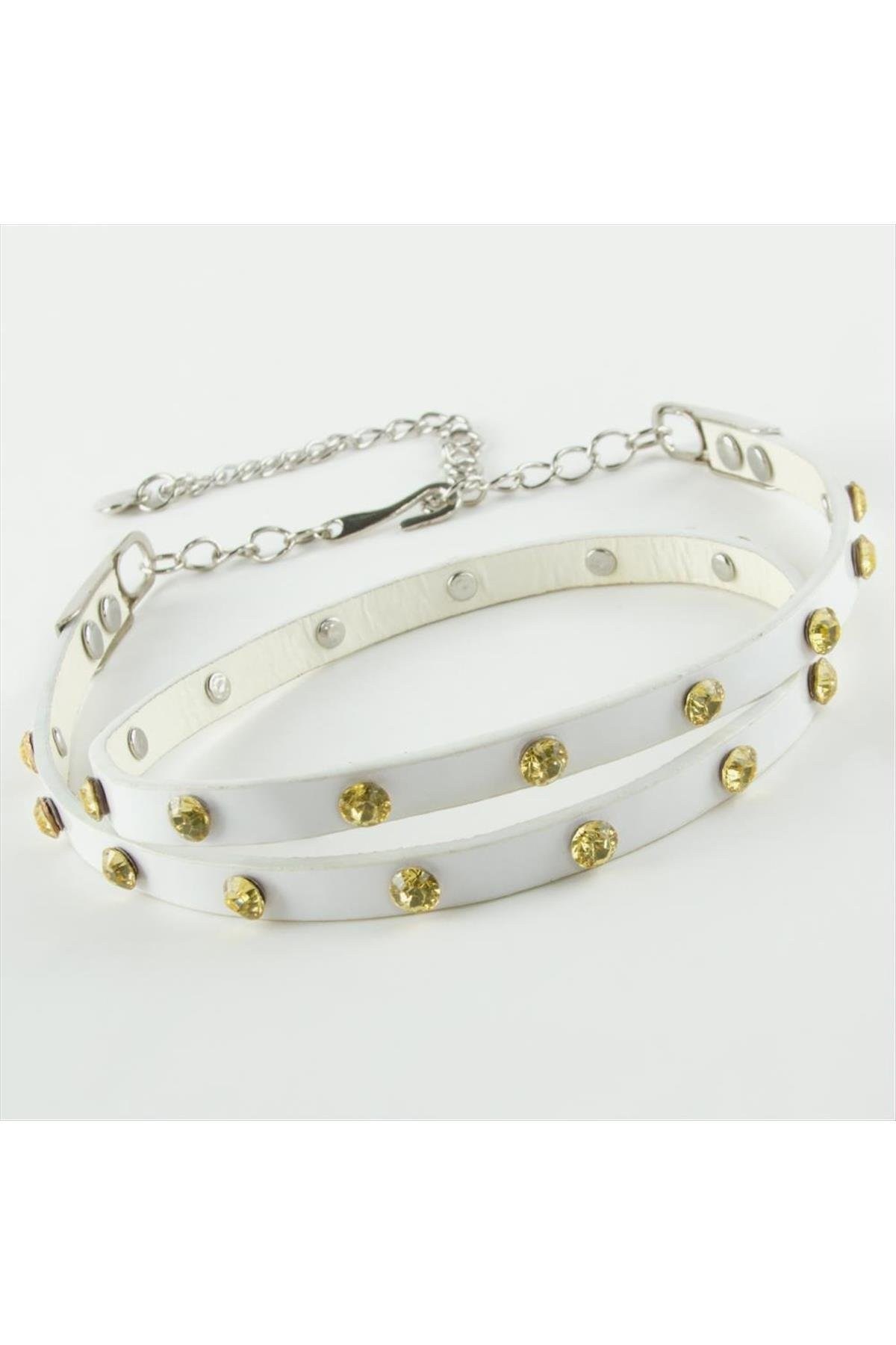 Ayarlanabilir metal zincirli ve kristal model taşlı deri kemer ürün uzunluğu uzatma zinciri dahil 103 cm genişliği 1 cm dir