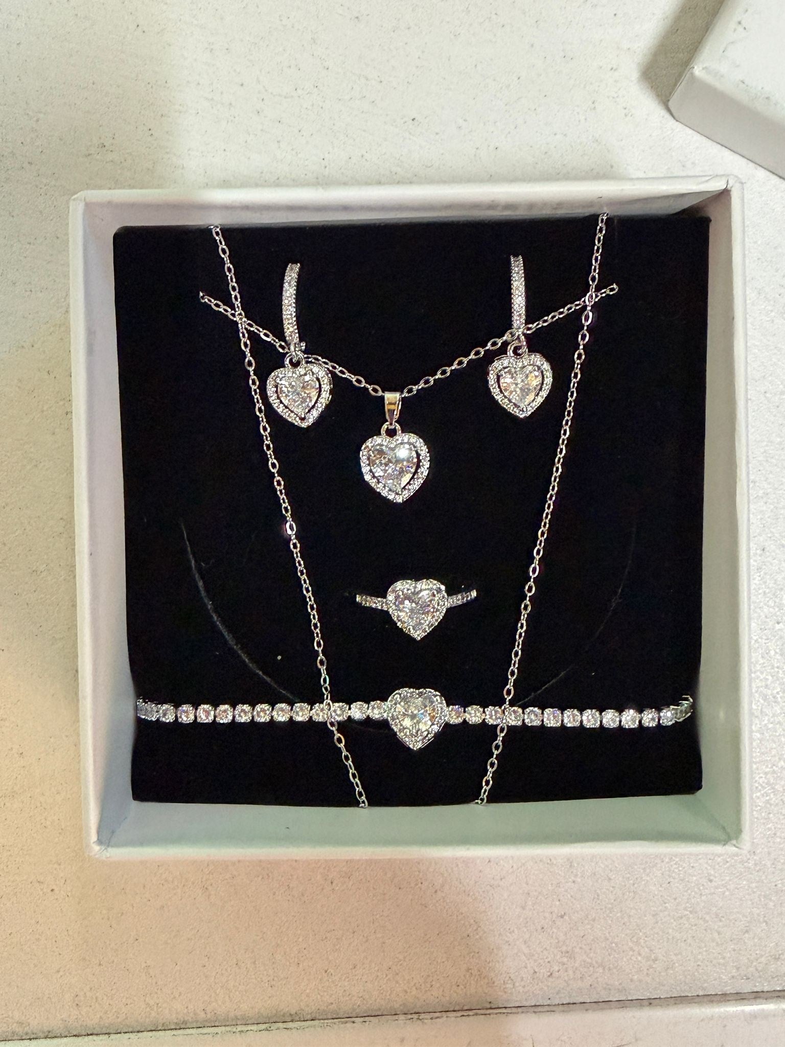 Tam Set İçeriği: Kalp figürlü Kolye, Bileklik, Yüzük ve Küpe.