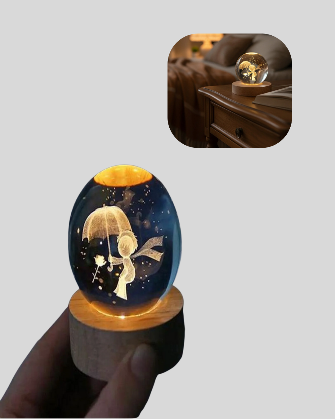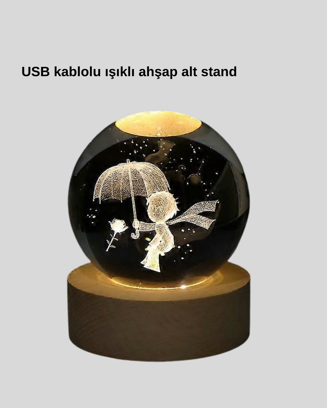 Küçük Prens'in büyülü dünyasını ışıkla birleştiren bu kristal top gece lambası, bulunduğu her ortama duygu, anlam ve estetik katar. Sıcak ışığıyla romantik bir ambiyans yaratırken kristal içerisindeki figür, odanın enerjisini değiştirir. Hem yetişkin odalarında hem çocuk odalarında dekoratif bir anlam taşır. Kitaplık, komodin, makyaj masası, ofis masası gibi alanlarda modern bir atmosfer oluşturur. Küçük Prens severler için koleksiyon değeri taşır.