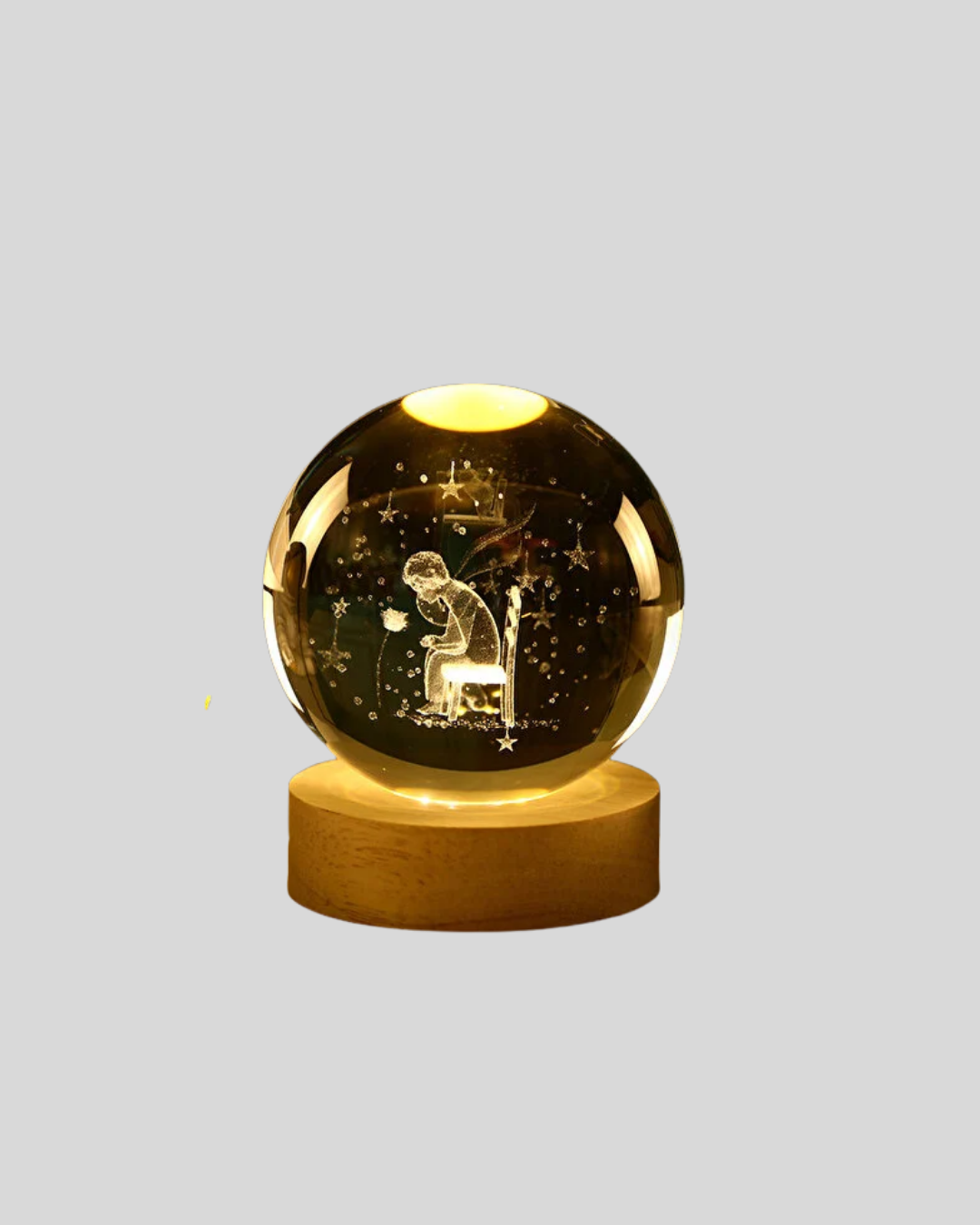 Bu özel tasarım cam küre, uzun ömürlü ve dayanıklı cam malzeme ile üretilmiştir. Ahşap stand, sağlam duruş ve estetik bütünlük sağlar. LED ışığı açıldığında Küçük Prens figürü büyüleyici bir parlaklık kazanır ve ortamda yumuşak bir ambiyans oluşur. USB ile çalışması sayesinde enerji tasarruflu ve güvenlidir. Hem işlevsel hem de dekoratif olmasıyla ev ve ofislerde çok tercih edilen bir üründür.