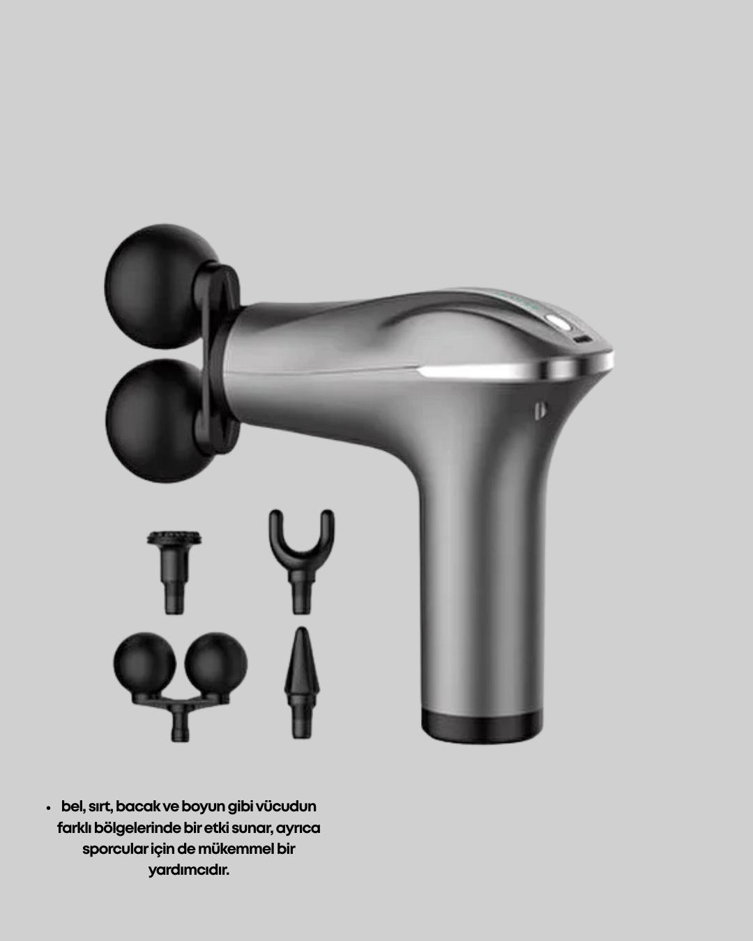 Şarjlı 4 başlıklı masaj tabancası, kas gerginliğini azaltmak ve vücudu rahatlatmak için geliştirilmiş çok yönlü bir masaj aletidir. Vücudun bel, sırt, boyun, bacak gibi çeşitli bölgelerinde etkili sonuçlar sunar. Günün yorgunluğunu atmak veya spor sonrası kasları rahatlatmak isteyen herkes için ideal bir çözümdür. Cihazla birlikte gelen dört farklı başlık, farklı kas grupları için özel olarak tasarlanmıştır. Büyük kas gruplarında geniş yüzeyli başlık tercih edilirken daha küçük kas bölgelerinde dar uçlu başlıklar ideal performans sağlar. Bu sayede kullanıcı kendi masaj deneyimini ihtiyaçlarına göre şekillendirebilir. Titreşim teknolojisiyle çalışan cihaz, kas derinlerine ulaşıp etkili bir gevşeme sağlar. Kas sıkışmalarını, gerginliği ve sertliği hafifletmek için kullanılabilir. Sporcular için antrenman sonrası toparlanmayı hızlandıran güçlü bir yardımcıdır. Şarjlı yapısı, cihazı tamamen kablosuz kullanma özgürlüğü sunar. Hem taşınabilir hem hafif olması sayesinde çantaya konulabilir ve her yerde kullanılabilir. Ev, ofis, spor salonu, seyahat gibi tüm ortamlarda pratik kullanım sağlar. Çoklu hız ayarı, masaj yoğunluğunu tamamen kullanıcı kontrolüne bırakır. İster hafif bir gevşeme ister güçlü bir kas masajı yapmak istiyor olun, cihaz her ihtiyaca uygun performans sunar. Ergonomik tasarımı elde rahat kavrama sağlar ve uzun süre kullanımda bile yorgunluk oluşturmaz. Günlük stres, yoğun iş temposu, spor sonrası kas ağrıları gibi durumlarda vücuda hızlı bir rahatlama sunan bu masaj tabancası, fonksiyonelliği ve estetik tasarımıyla öne çıkan etkili bir kişisel bakım ürünüdür.