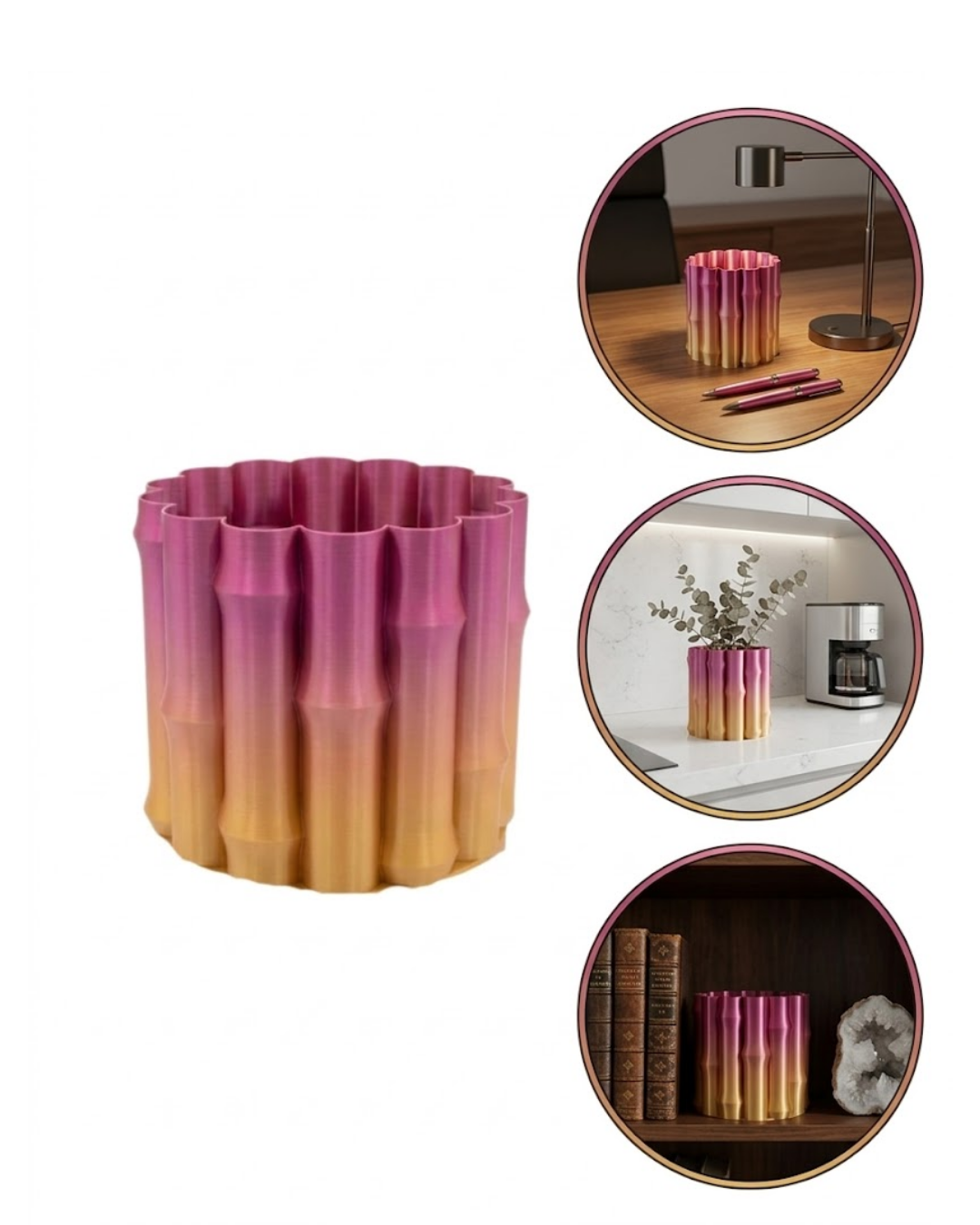 Modern tasarım anlayışını yansıtan 3D mor sarı vazo, ev dekorasyonunda fark yaratmak isteyenler için özel olarak tasarlanmıştır. Dalgalı ve akışkan formu, klasik vazolardan ayrılarak bulunduğu ortama modern bir hava katar. Mor ve sarı tonlarının uyumlu geçişi, ürüne hem zarif hem de enerjik bir görünüm kazandırır. Kaliteli üretim yapısı sayesinde dayanıklı ve uzun ömürlüdür. Hafif yapısı sayesinde kolay taşınabilir ve farklı alanlarda rahatlıkla konumlandırılabilir. Salon sehpası, TV ünitesi, raf veya çalışma masasında dekoratif obje olarak kullanılabilir. Minimal dekorasyon sevenler için sade ama dikkat çekici bir parça olan bu vazo, aynı zamanda kombin yapılabilir bir üründür. Kurutulmuş çiçekler, pampas veya yapay çiçeklerle birlikte kullanıldığında çok daha şık bir görünüm elde edilir.