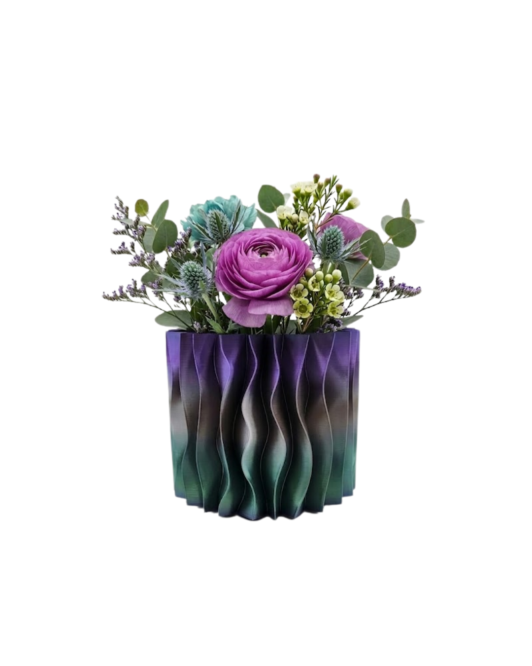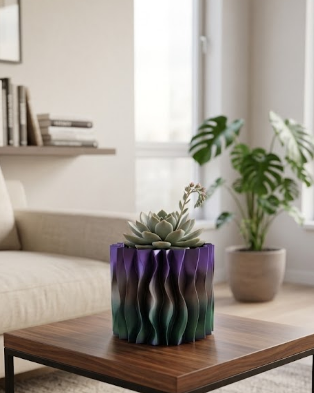 Modern dalgalı tasarımlı mor 3D dekoratif vazo, estetik görünümü ve özgün tasarımı ile yaşam alanlarında dikkat çeken dekoratif ürünlerden biridir. Dalga formunda tasarlanan yüzey yapısı sayesinde klasik vazolardan farklı bir görünüm sunar. Bu özgün tasarım hem modern hem de sanatsal dekorasyon anlayışını yansıtan estetik bir form oluşturur. Mor renk tonlarının oluşturduğu şık görünüm ise ürüne zarif ve dikkat çekici bir karakter kazandırır. 3D baskı teknolojisi kullanılarak üretilen bu dekoratif vazo, dalgalı yüzey formu ve modern geometrik tasarımı sayesinde oldukça estetik bir görünüm sunar. Ürünün yüzeyindeki dalga formu ışık ile farklı açılarda farklı gölgeler oluşturarak dekoratif bir derinlik hissi yaratır. Bu özellik sayesinde bulunduğu ortamda dikkat çekici bir dekoratif obje olarak öne çıkar. Mor renk tonları dekorasyon dünyasında zarafet, modernlik ve estetik ile ilişkilendirilen renkler arasında yer alır. Bu nedenle mor dekoratif vazo modern ev dekorasyonlarında, minimalist dekorasyon stillerinde ve sanatsal dekorasyon konseptlerinde oldukça uyumlu bir kullanım sunar. Dekoratif mor 3D vazo özellikle kuru çiçekler, dekoratif dallar veya küçük bitkiler ile birlikte kullanıldığında oldukça şık bir görünüm oluşturur. Bunun dışında masa dekoru, raf dekoru veya sehpa üzerinde dekoratif obje olarak da kullanılabilir. Salon, çalışma odası, kitaplık, televizyon ünitesi veya ofis masası üzerinde kullanıldığında bulunduğu ortama modern ve estetik bir atmosfer kazandırır. Minimalist dekorasyon, modern dekorasyon veya bohem dekorasyon stilleri ile uyum sağlayabilecek bir tasarıma sahiptir. Modern dalgalı tasarımlı mor 3D dekoratif vazo aynı zamanda dekoratif hediye arayanlar için de oldukça özel bir alternatiftir. Ev hediyesi, yeni ev hediyesi veya ofis hediyesi olarak tercih edilebilir. Estetik tasarımı, modern görünümü ve sanatsal formu sayesinde bu dekoratif vazo yaşam alanlarında şık ve dikkat çekici bir dekoratif aksesuar olarak öne çıkar.