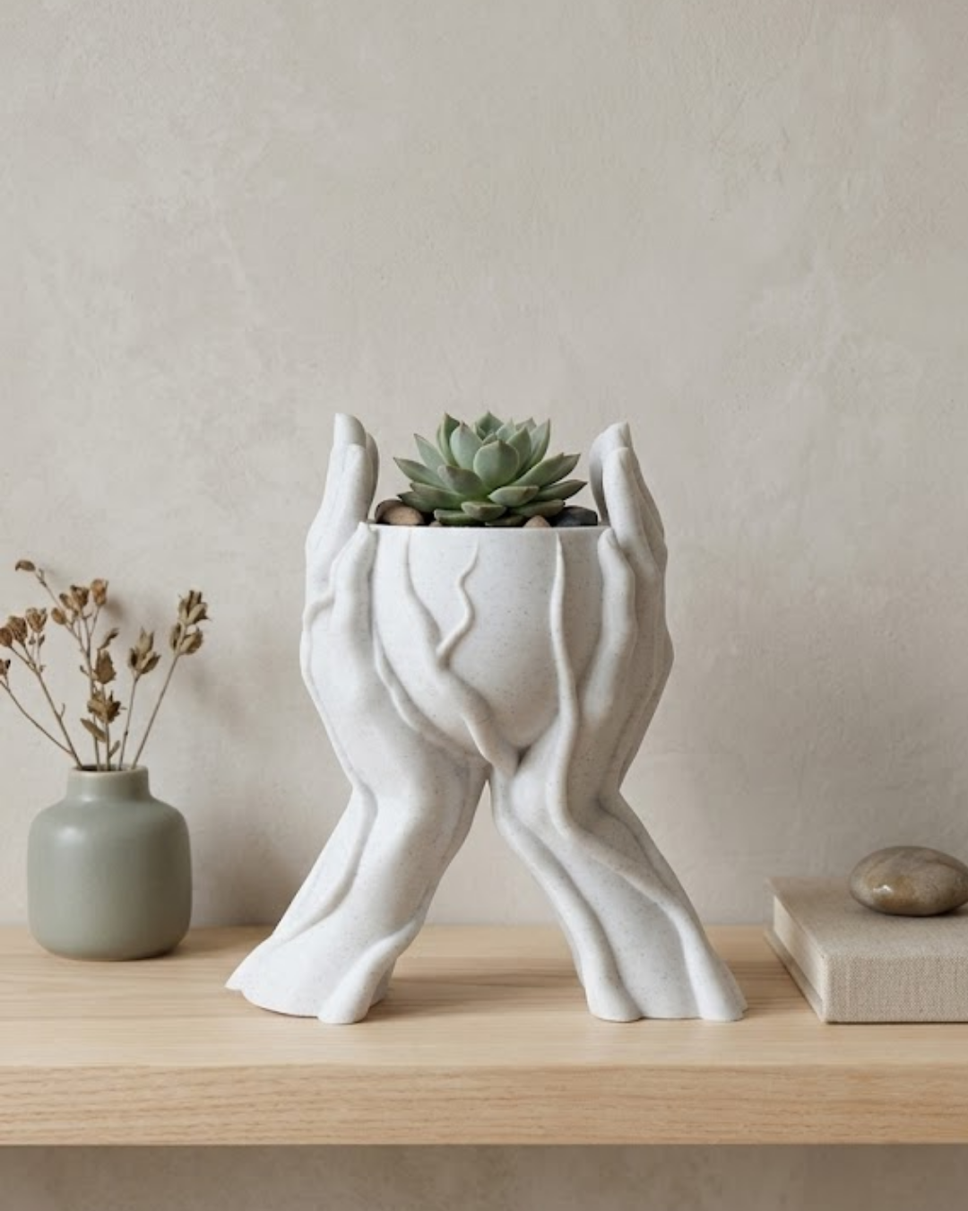 Dekoratif 3D el tasarımlı saksı vazo, modern ve estetik tasarımı sayesinde yaşam alanlarında fark yaratan dekoratif ürünlerden biridir. İki elin bir objeyi nazikçe tutuyormuş gibi tasarlanması ürüne hem sanatsal hem de minimalist bir görünüm kazandırır. Bu özgün tasarım sayesinde ürün yalnızca bir saksı değil aynı zamanda dekoratif bir sanat objesi olarak da değerlendirilebilir. 3D baskı teknolojisi ile üretilen bu dekoratif vazo, detaylı el figürü ve akıcı yüzey yapısı sayesinde oldukça estetik bir görünüm sunar. Eller tarafından desteklenen formu ürüne güçlü bir görsel karakter kazandırırken modern dekorasyon anlayışı ile uyum sağlayan farklı bir stil ortaya çıkarır. Dekoratif el figürlü saksı vazo özellikle küçük bitkiler için oldukça uygun bir kullanım alanı sunar. Sukulent bitkiler, kaktüsler veya küçük dekoratif çiçekler ile birlikte kullanıldığında oldukça şık bir görünüm elde edilir. Bunun dışında kalemlik olarak masa üzerinde kullanılabilir veya raf dekoru olarak değerlendirilebilir. Salon, çalışma odası, ofis masası veya kitaplık üzerinde kullanıldığında bulunduğu ortama estetik bir atmosfer kazandırır. Modern dekorasyon, minimalist dekorasyon veya sanatsal dekorasyon stilleri ile uyum sağlayabilecek bir tasarıma sahiptir. Dekoratif 3D el tasarımlı vazo aynı zamanda dekoratif hediye alternatifi olarak da tercih edilebilir. Ev hediyesi, yeni ev hediyesi, doğum günü hediyesi veya dekorasyon meraklıları için oldukça anlamlı bir dekoratif üründür. Estetik tasarımı, modern görünümü ve sanatsal formu ile dekoratif el figürlü 3D vazo yaşam alanlarında şık ve dikkat çekici bir dekoratif aksesuar olarak öne çıkar.
