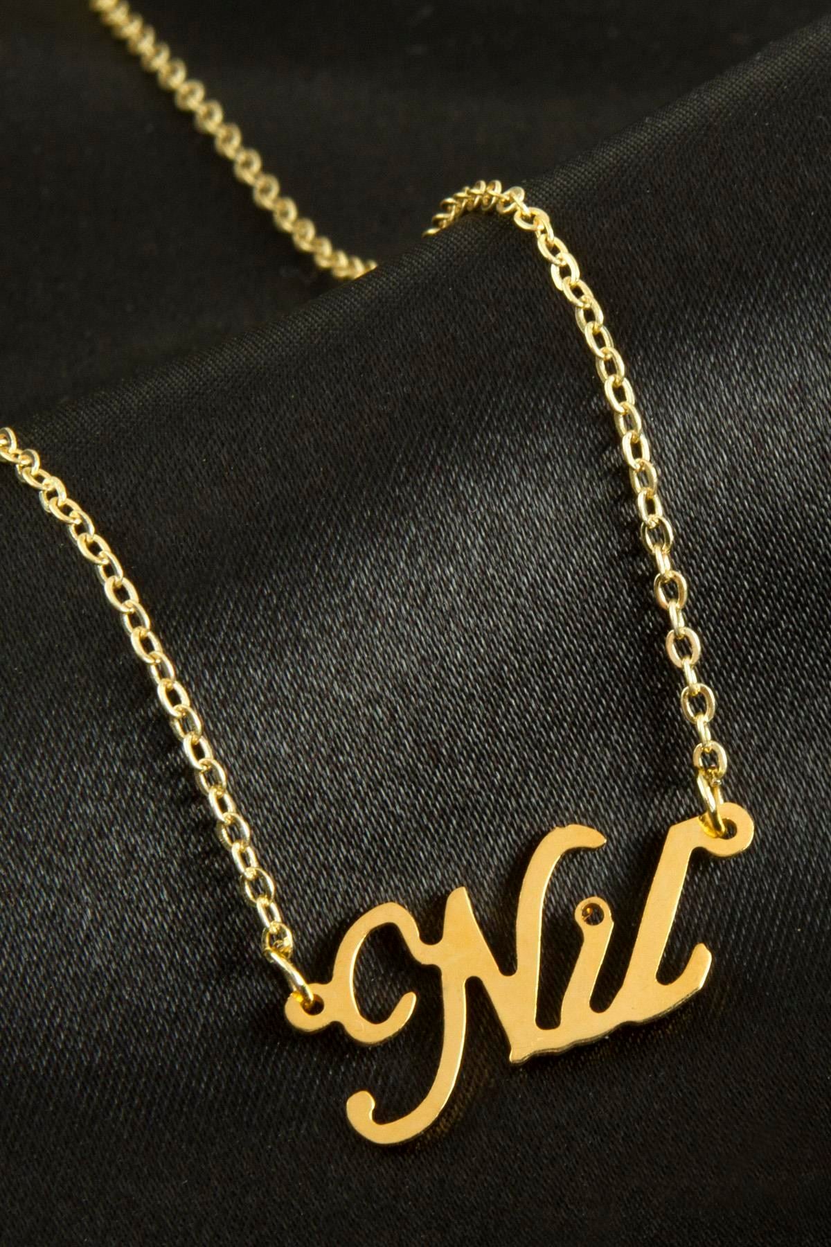 Nil İsimli Kolye. İsimli kolye pirinç madeninden ve altın kaplamalıdır. Kişiye özel üretilmektedir.Yazdırmak istediğiniz ismi bize mesaj olarak iletmeniz gerekmektedir. Kullanıma bağlı olarak uzun süre kullanıma uygundur. Ürün malzemesi 1.sınıf kalitededir. Ürün ve zinciri sarı renktedir. Ürün zincir boyu 45 cm ve ürün üzerindeki isimler yaklaşık 3 cmdir. İsim boyları ürün ismine göre degişiklik göstermektedir.