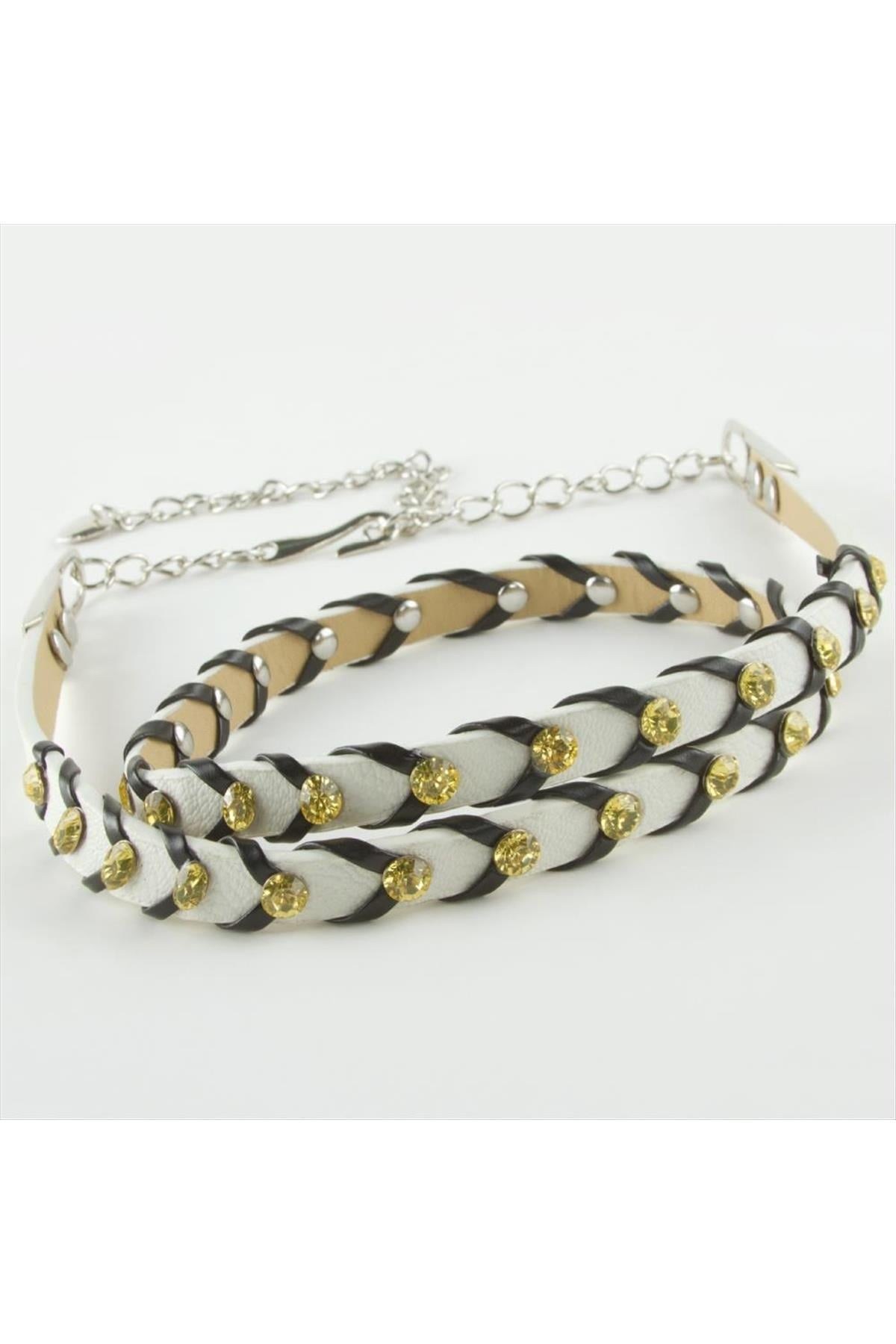 Örgü modelli kristal model taşlı ve ayarlanabilir zincirli deri kemer. ürün uzunluğu uzatma zinciri dahil 103 cm genişliği 1 cm dir