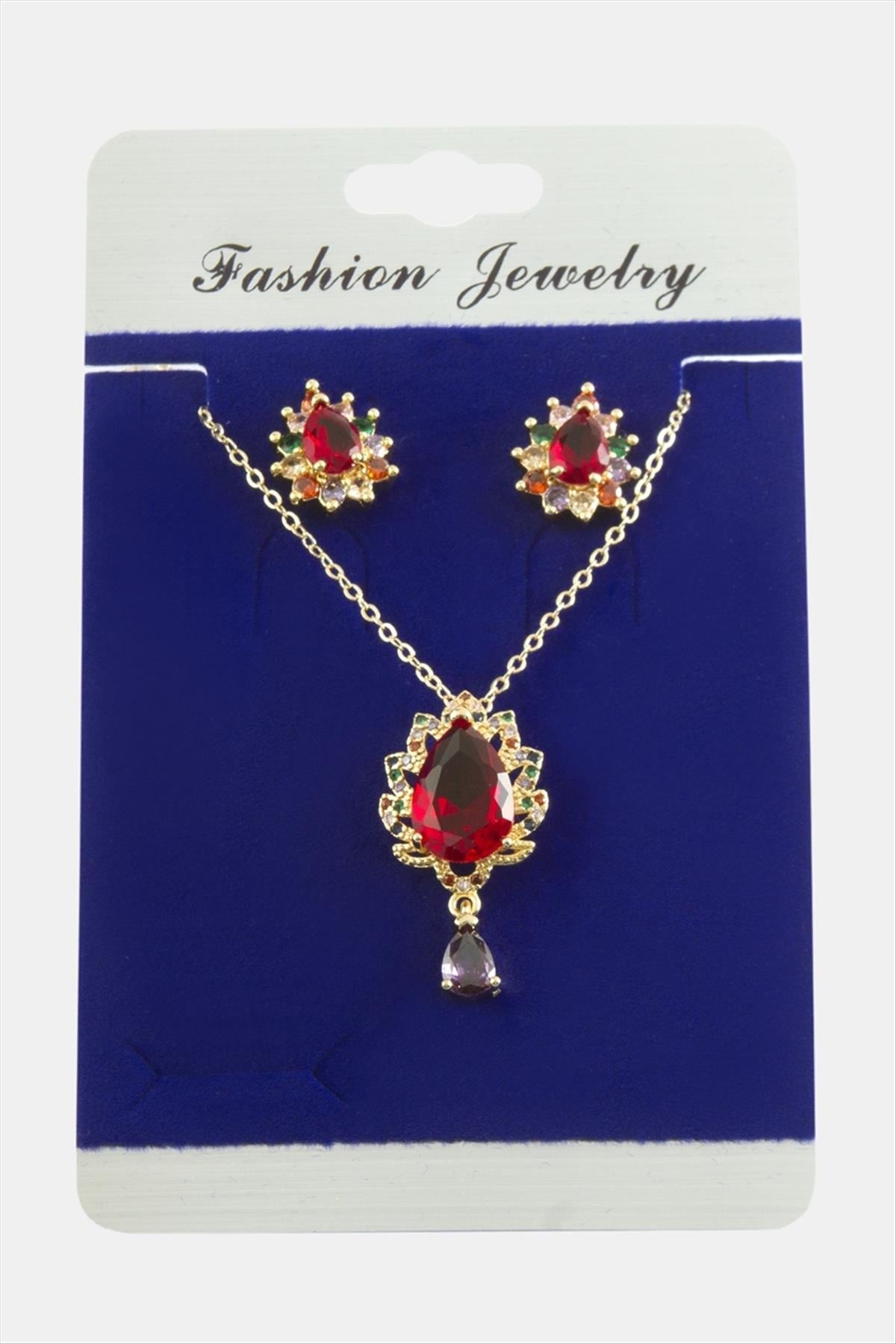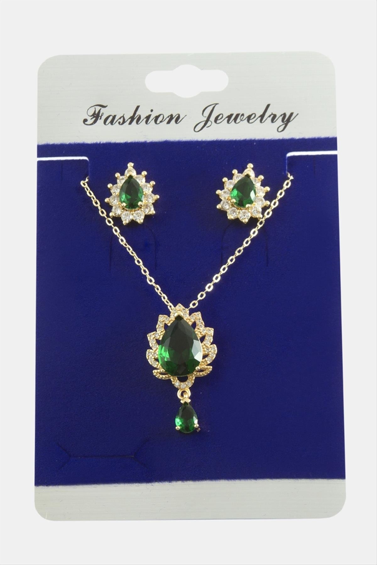 Kolye; Ürün malzemesi metal ve zirkon taştan üretilmiştir. 1 sınıf kaliteli malzeme kullanılmıştır. Ürün 1 adet kolye, ve 1 adet çift küpe vardır. Ürün zincir uzunluğu 45 santimdir. Ürün ucundaki taşlı aparat boyu 2 cmdir.