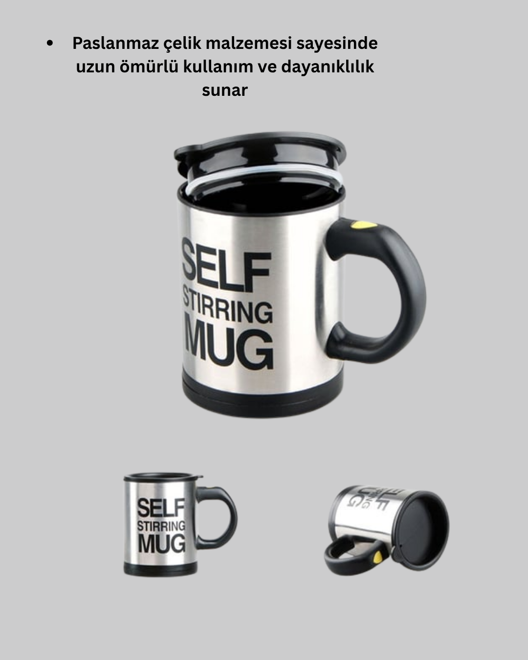 Şık tasarımı ve modern teknolojisiyle öne çıkan paslanmaz çelik kendi kendini karıştıran akıllı kupa, kahve ve içecek keyfini yepyeni bir seviyeye taşıyor. Dayanıklı paslanmaz çelik gövdesi, uzun ömürlü kullanım sunarken aynı zamanda içeceğinizin sıcaklığını koruyarak her yudumda ideal lezzeti yakalamanızı sağlar. Tek tuşla çalışan otomatik karıştırma mekanizması, çay, kahve, süt tozu, protein shake veya enerji içeceklerinizi saniyeler içinde mükemmel kıvama getirir. Karıştırıcı kaşık veya mikser kullanmanıza gerek kalmadan pratik ve hijyenik bir deneyim sunar. Isı yalıtım özelliği sayesinde sıcak içeceklerinizi uzun süre sıcak, soğuk içeceklerinizi ise ferah şekilde korur.  ofiste, evde veya seyahatlerde tarzınızı yansıtır.Kaymaz tabanlı yapısı, masa üzerinde güvenli duruş sağlar; ergonomik kulp tasarımı ise kullanım kolaylığı sunar. Günün her saatinde sıcak kahve, pürüzsüz sütlü kahve ya da lezzetli shake’ler hazırlamak artık çok kolay.Kendi kendini karıştıran paslanmaz çelik kupa, hem estetik hem de fonksiyonelliği bir araya getirerek teknolojiyle konforu buluşturur.