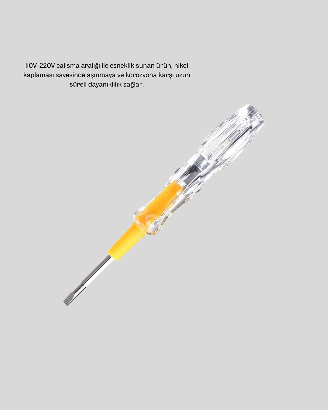 Yüksek güvenlik ve dayanıklılığı bir arada sunan bu profesyonel neon kontrollü kontrol kalemi, hem ev tipi hem de endüstriyel elektrik uygulamaları için ideal bir seçimdir. Tam sızdırmazlık sağlayan pirinç kapak, ürünün uzun ömürlü olmasını sağlarken, elektrik kaçaklarını önleyerek maksimum güvenlik sunar. Şeffaf yalıtkan sapı, elektrik yalıtımı görevini mükemmel şekilde yerine getirir ve kullanım sırasında darbeye karşı üstün direnç gösterir. Kalem üzerindeki neon lamba, aktif akımın varlığını kolayca görmenizi sağlar. Bu sayede 110V - 220V arasındaki geniş çalışma aralığında, enerji hattı kontrolü ve elektrik testi işlemleri son derece güvenli ve pratik hale gelir. Özellikle düşük ışıklı ortamlarda bile neon göstergesi sayesinde net görünürlük sağlanır. Nikel kaplama uç kısmı, oksitlenmeye ve aşınmaya karşı ekstra koruma sunar; böylece uzun yıllar boyunca ilk günkü performansını korur. Hassas işlenmiş uç tasarımı, vida yuvalarına tam oturarak yüksek temas yüzeyi oluşturur ve doğru ölçüm yapmanızı sağlar. Profesyonel standartlarda üretilen bu kontrol kalemi, tamir, montaj, bakım ve elektrik test işlemlerinde güvenli kullanım sağlar. Ev kullanıcıları, teknisyenler ve ustalar için vazgeçilmez bir yardımcıdır.Kompakt boyutu sayesinde cebinizde veya alet çantanızda kolayca taşınabilir. Güvenliği, dayanıklılığı ve ergonomik yapısıyla bu test kalemi, her elektrik uygulamasında profesyonel sonuçlar elde etmenizi sağlar.