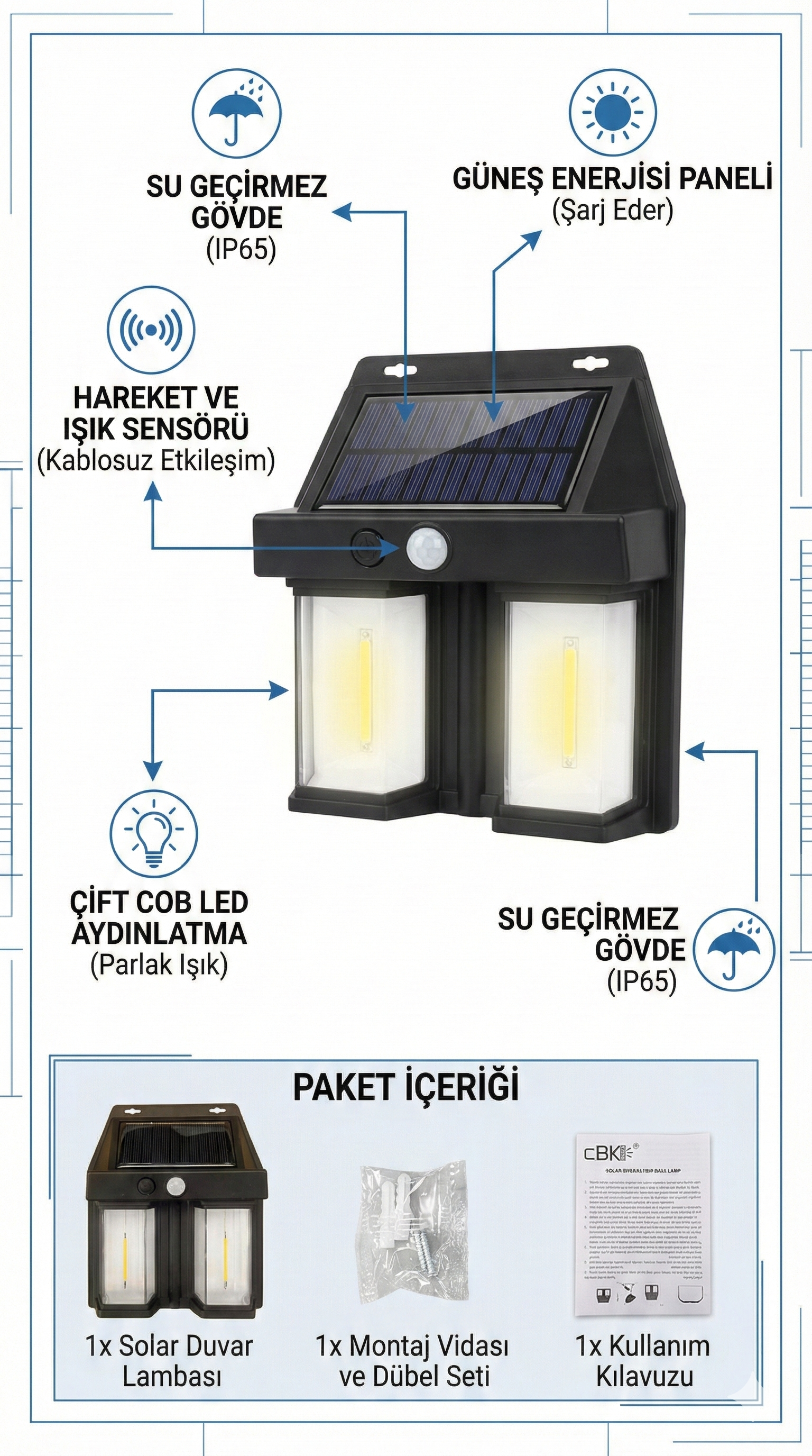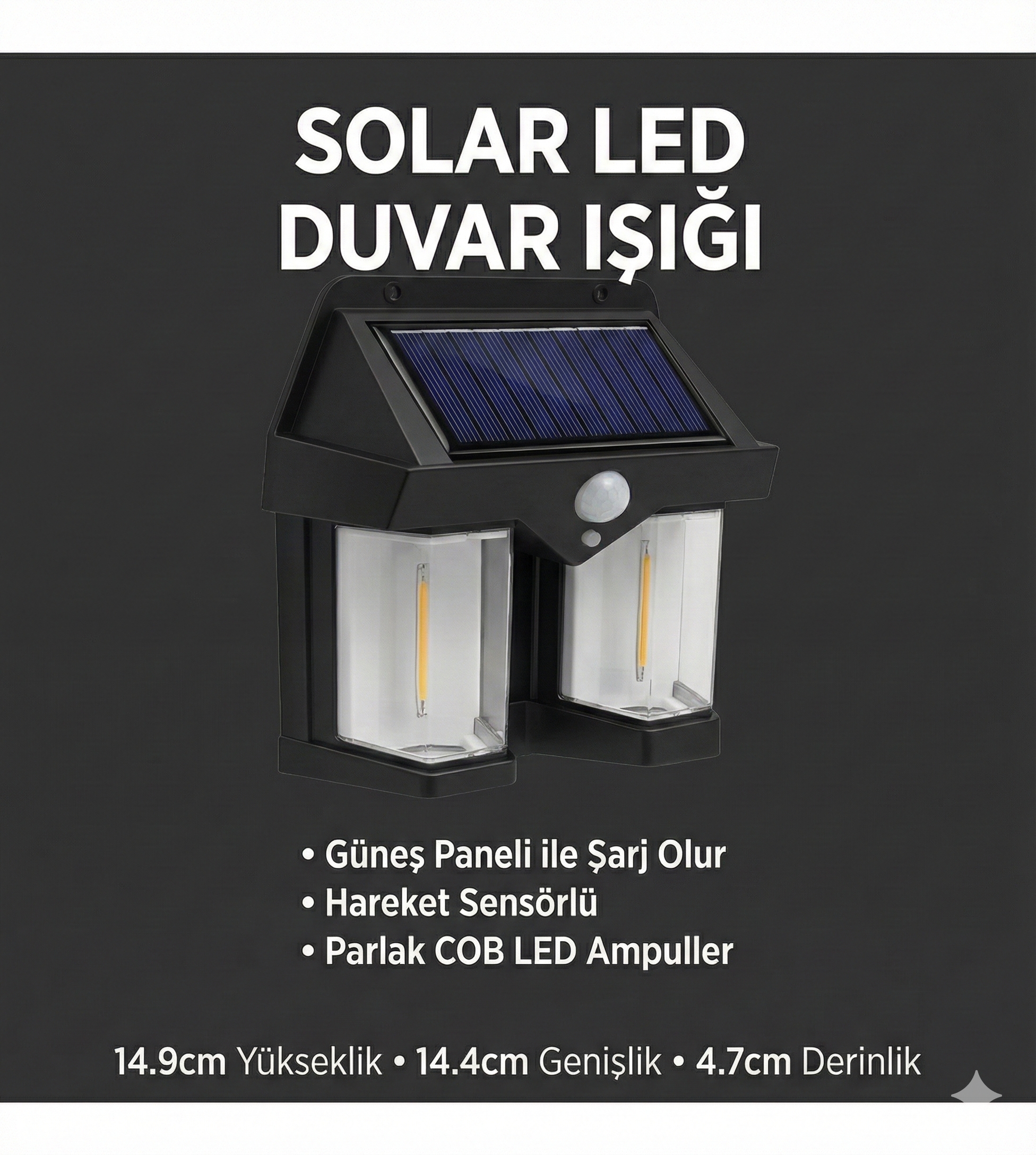• Çift LED Işık: İki adet enerji tasarruflu LED ışıkla donatılan bu lamba, iç veya dış mekanlarınız için yeterli aydınlatma sağlar.