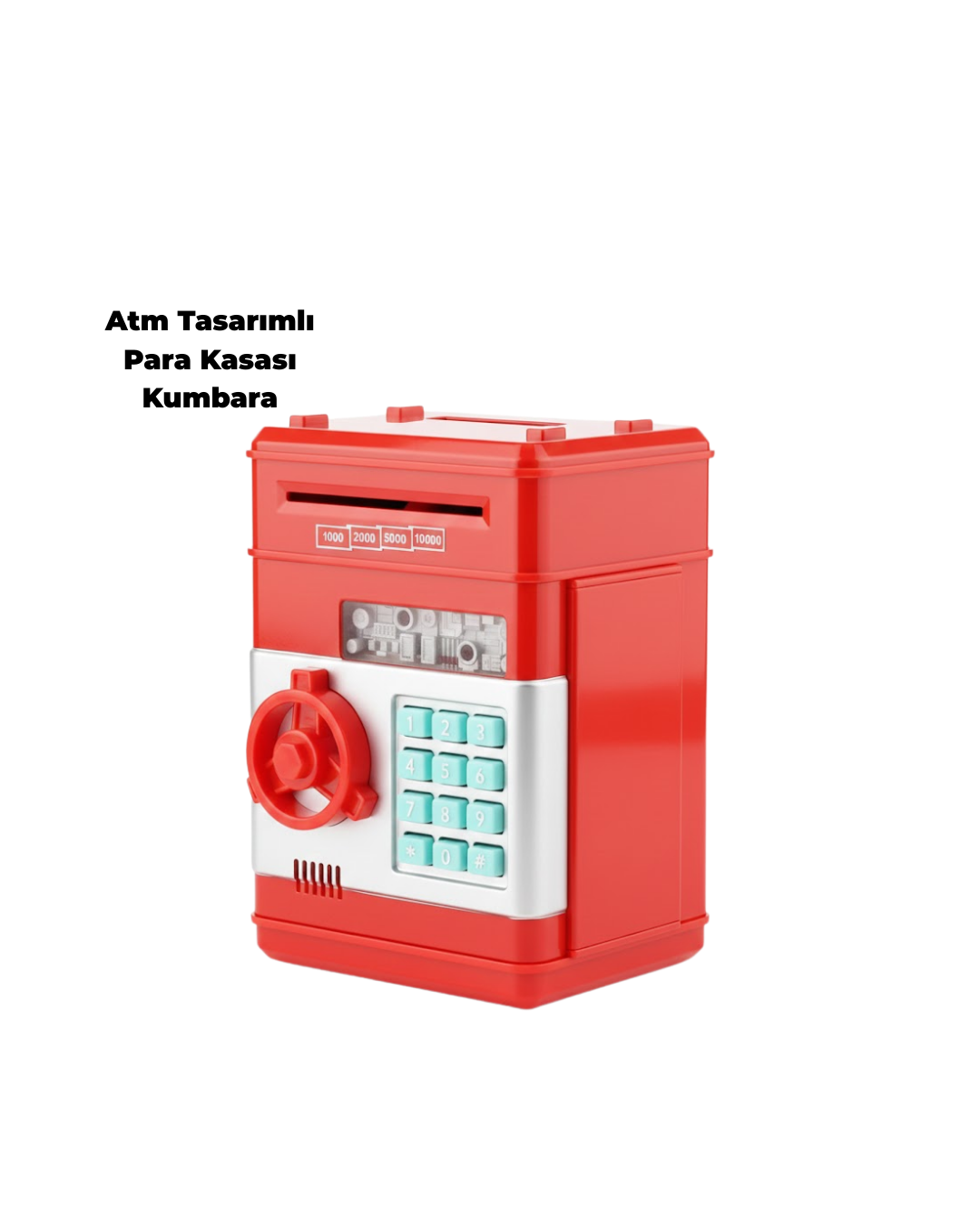 Bu kırmızı ATM görünümlü şifreli kumbara, hem eğitici hem de dekoratif bir üründür. Para kasası tasarımı, otomatik para girişi ve şifreli güvenlik sistemiyle öne çıkar. Para biriktirme alışkanlığını kazandırmak için ideal olan bu ürün, aynı zamanda şık ve eğlenceli bir hediye seçeneğidir.