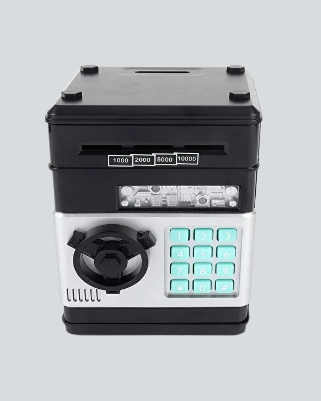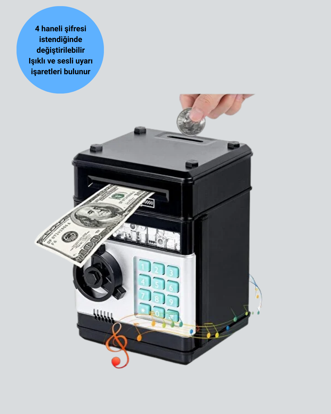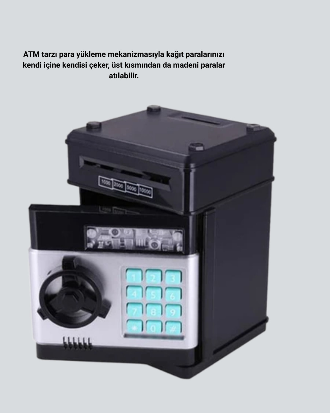 Geniş hazneli bu şifreli ATM tarzı elektronik kumbara, para biriktirmeyi hem güvenli hem de eğlenceli hale getirir. ATM mekanizması, kâğıt paraları otomatik olarak içine çeker. Şifreli güvenlik sistemi, ışıklı ve sesli uyarılarla desteklenmiştir. Dayanıklı yapısı uzun ömürlü kullanım sunar. Ev, ofis ve çocuk odaları için uygundur. Tasarruf bilinci kazandıran bu ürün, doğum günü ve özel günler için ideal bir hediye seçeneğidir.