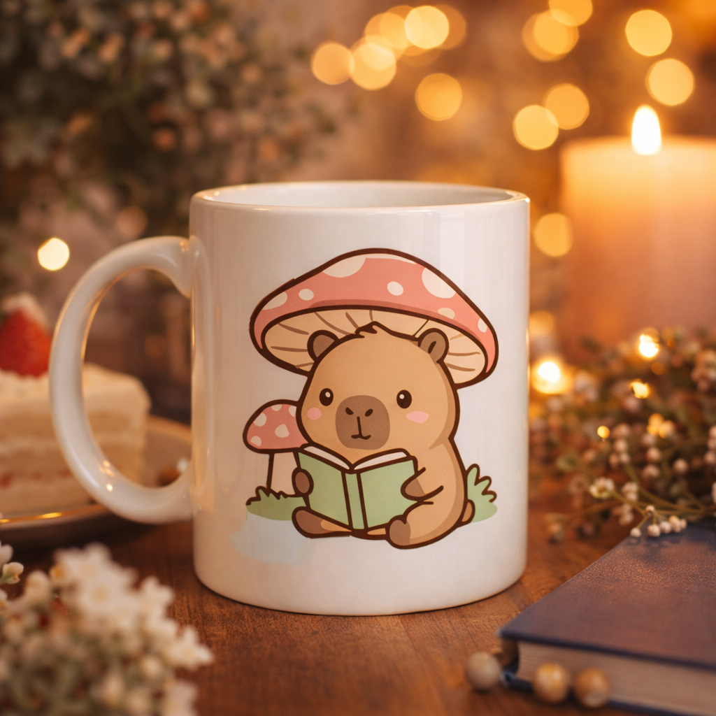 Kitap okuyan tatlı kapibara figürüyle tasarlanan bu porselen kupa, huzur veren enerjisiyle gününüze sıcak bir dokunuş katıyor.